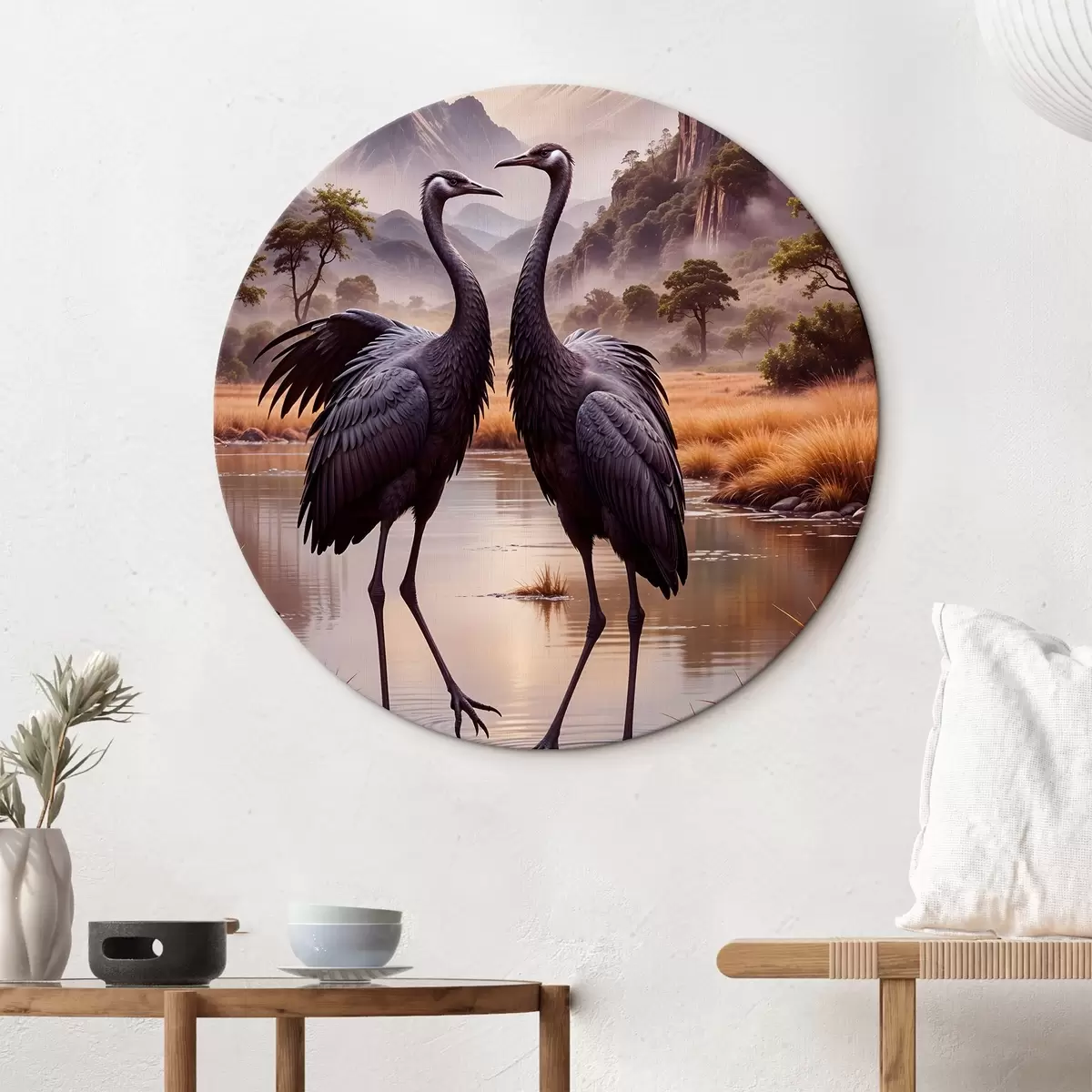 Quadri rotondi Due grandi gru nere in piedi in uno stagno poco profondo, con un paesaggio montuoso sullo sfondo r42240