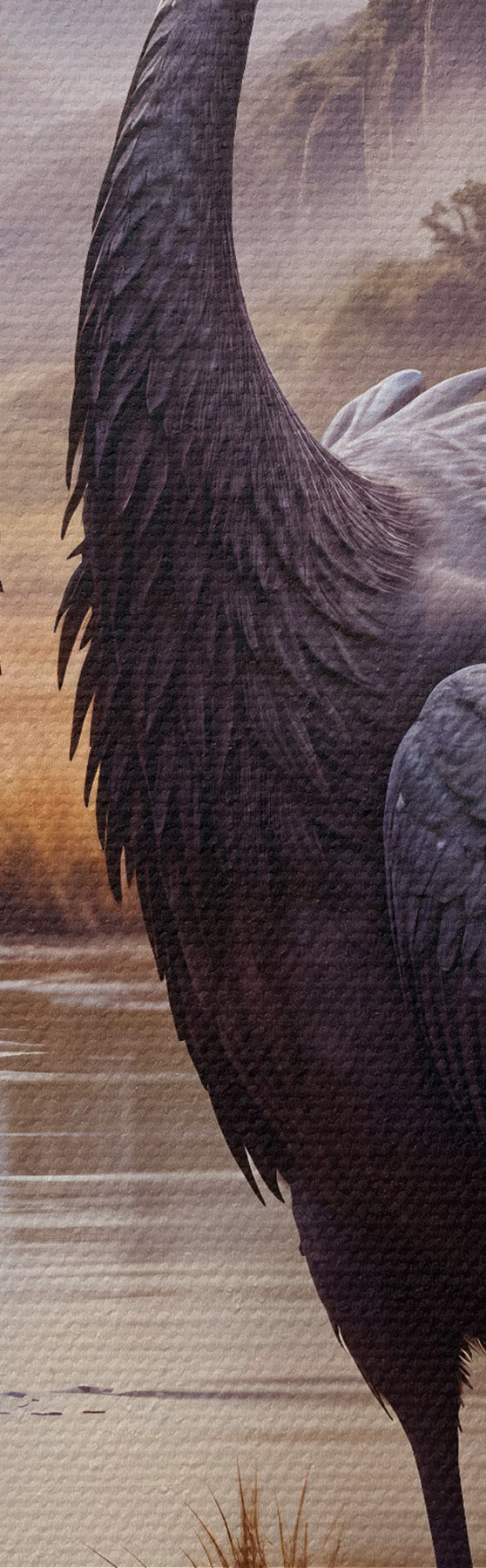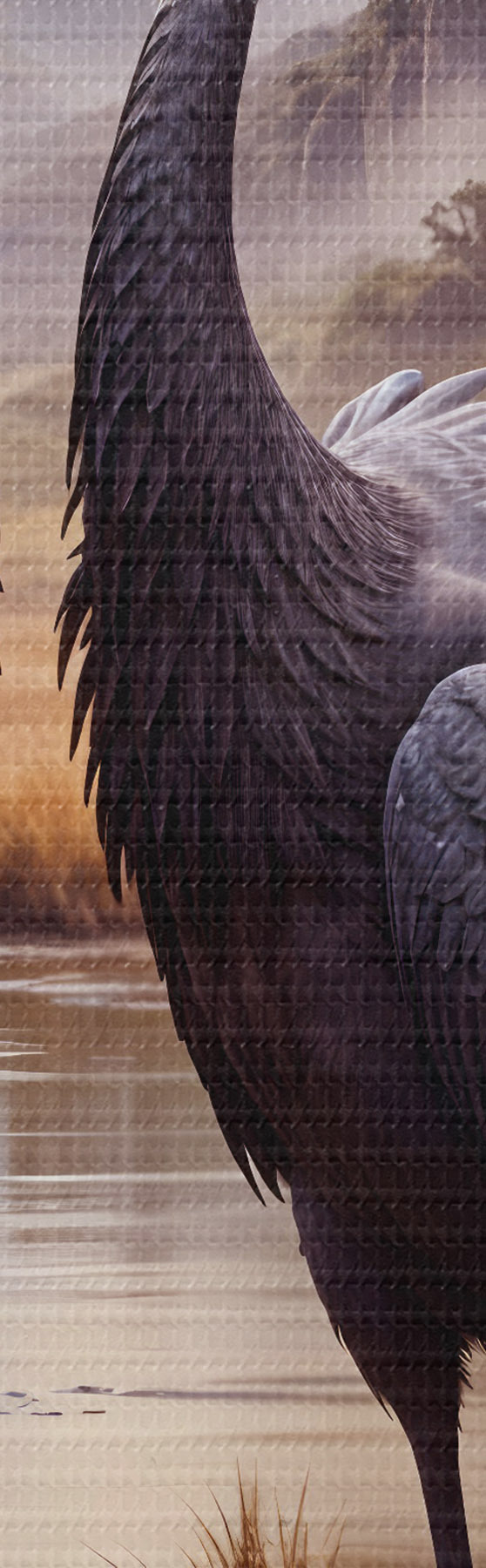 Immagine Due grandi gru nere in piedi in uno stagno poco profondo, con un paesaggio montuoso sullo sfondo Nr r42240
