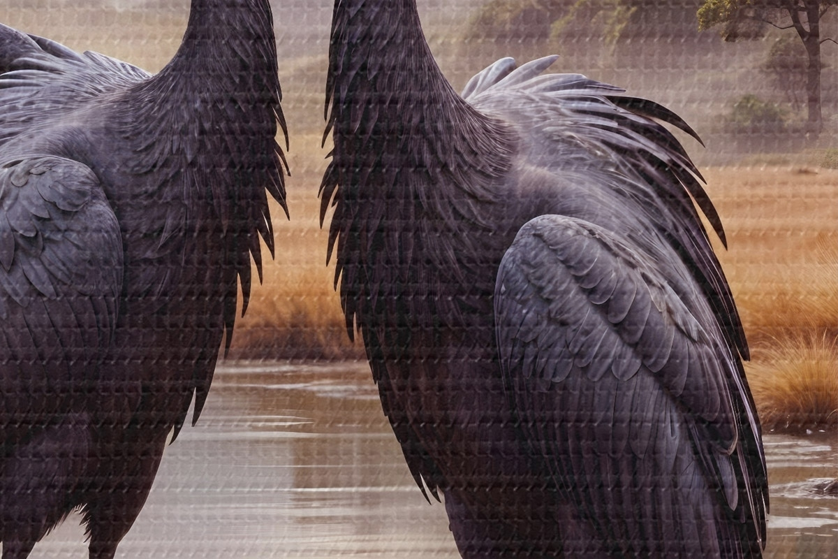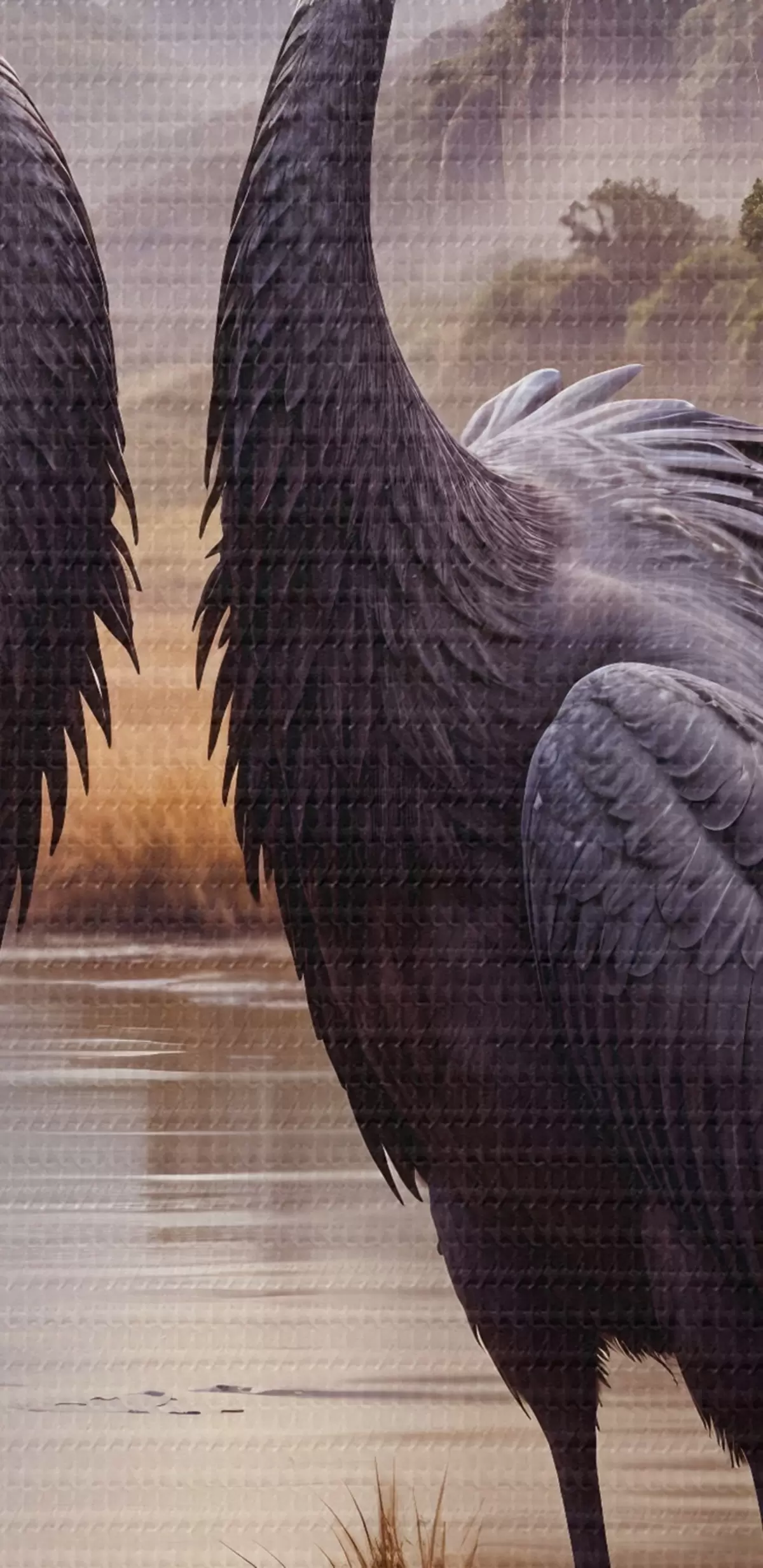 Immagine Due grandi gru nere in piedi in uno stagno poco profondo, con un paesaggio montuoso sullo sfondo Nr r42240