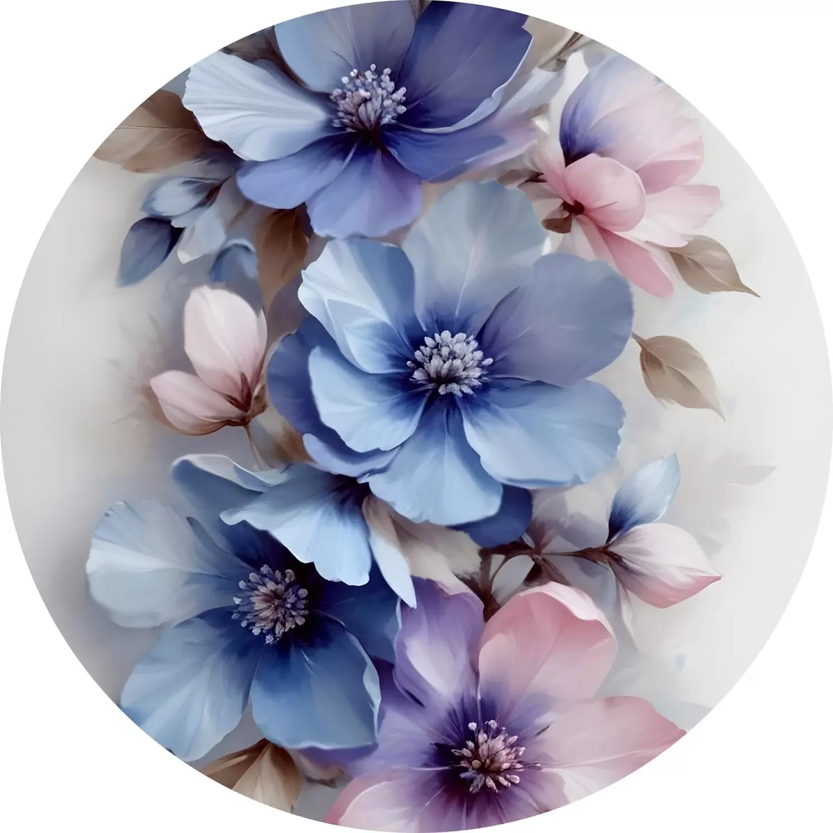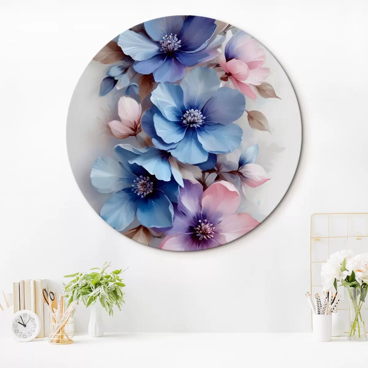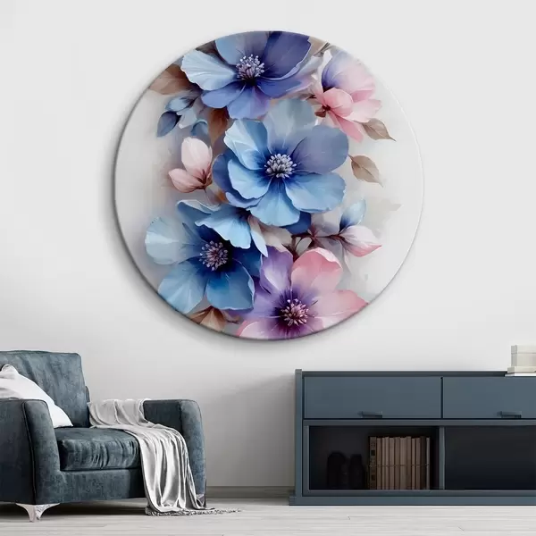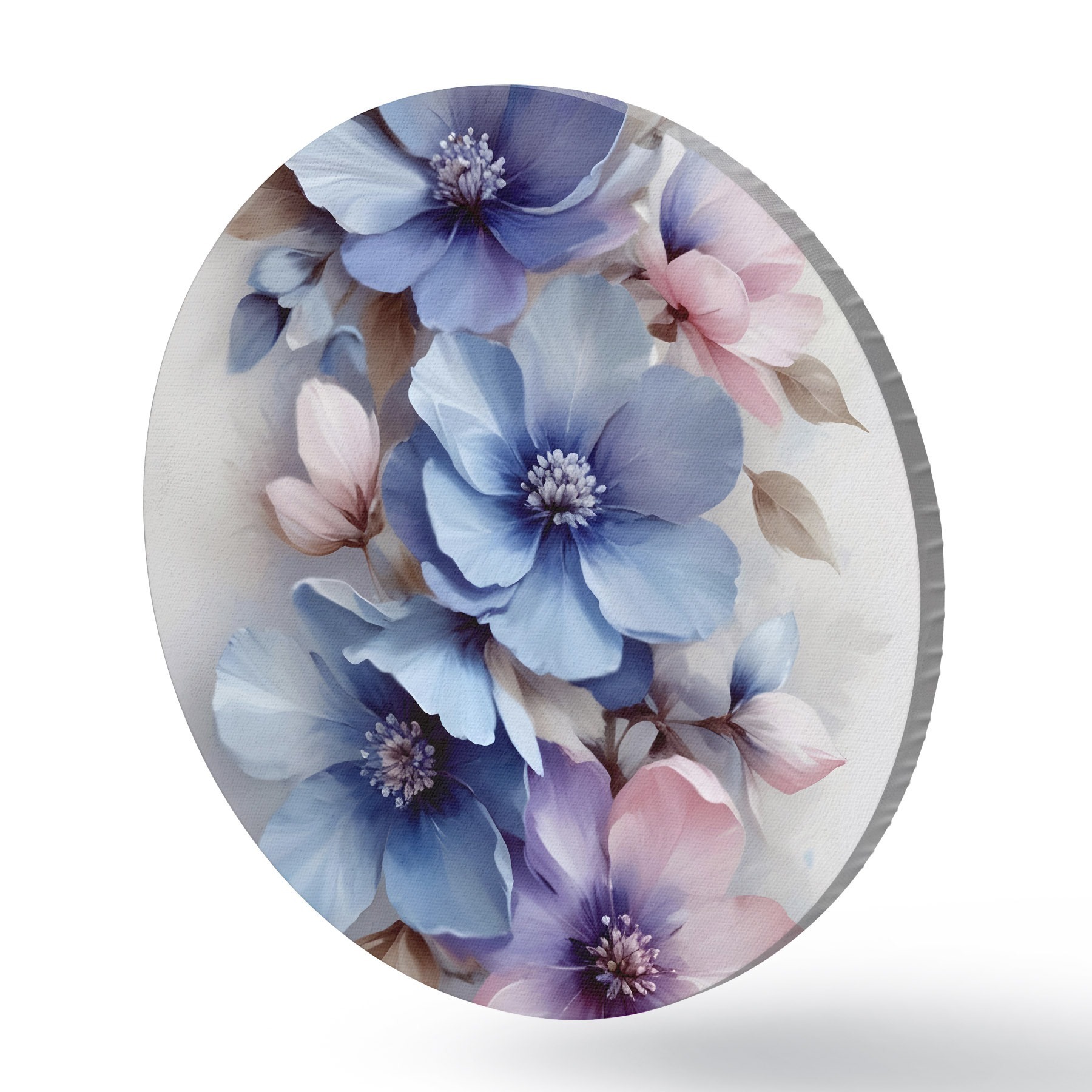Quadri rotondi Delicati fiori blu e rosa con petali e centri morbidi, disposti in una splendida stampa floreale su sfondo chiaro r42241