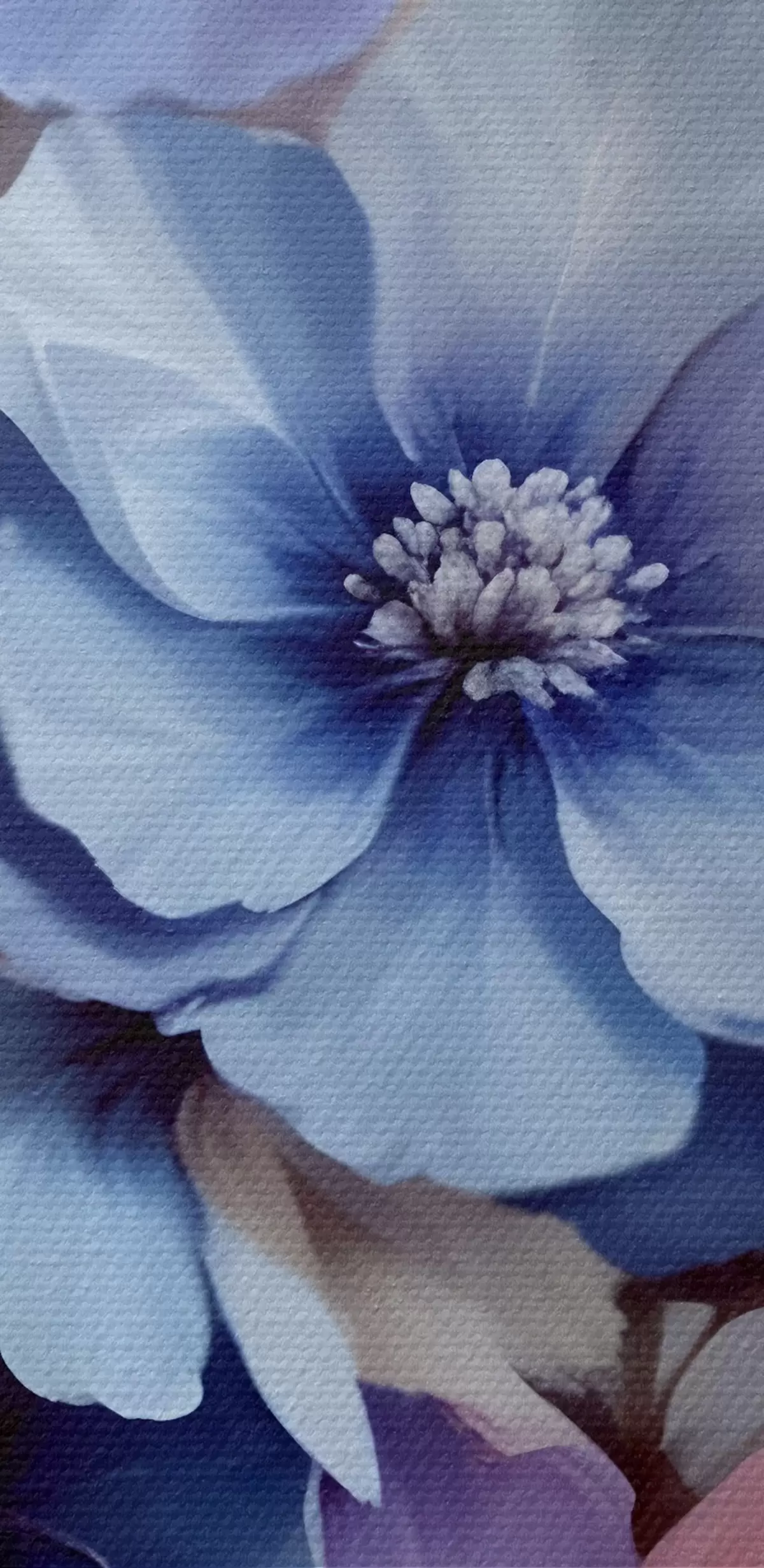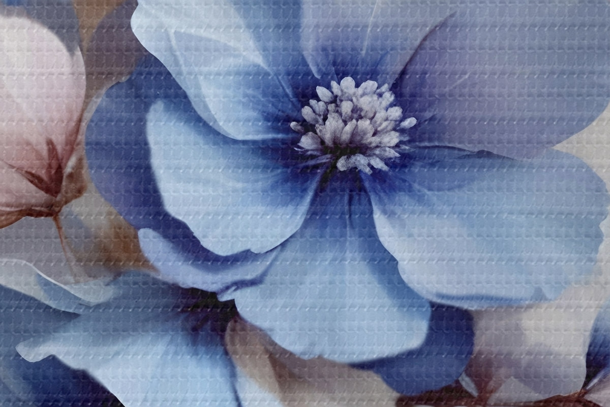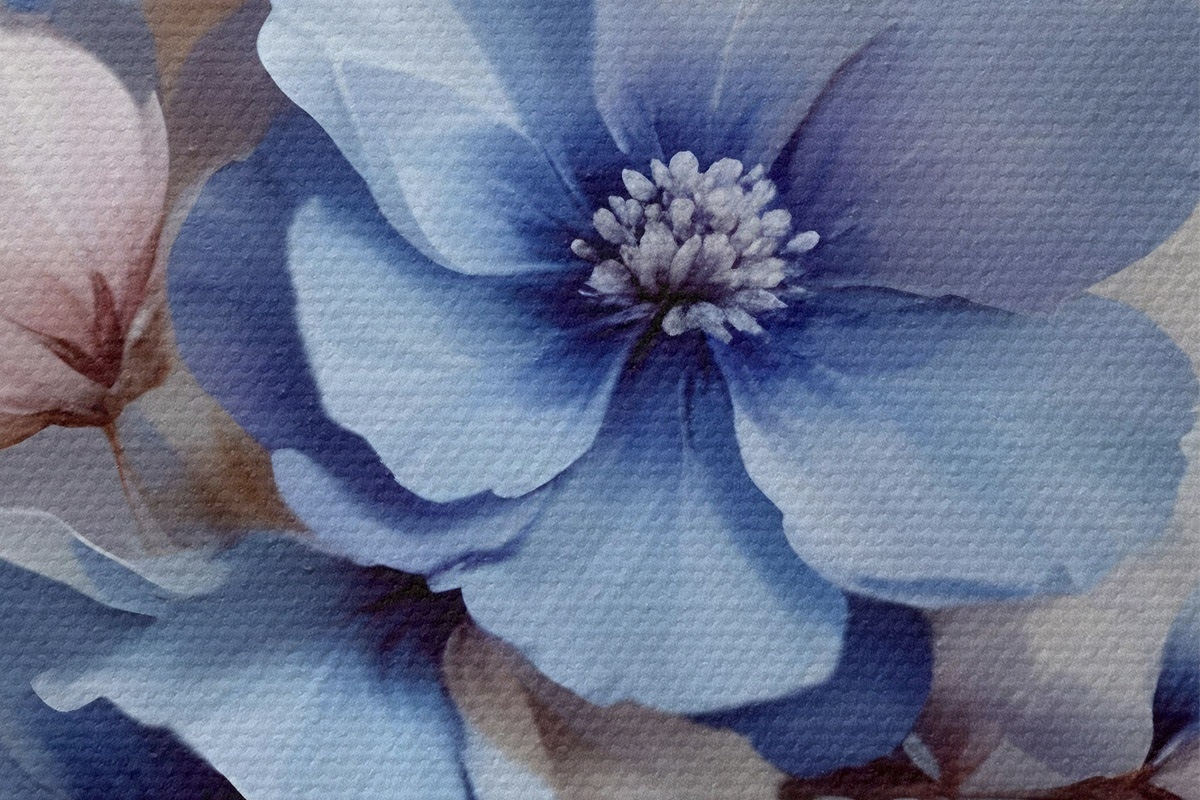Immagine Delicati fiori blu e rosa con petali e centri morbidi, disposti in una splendida stampa floreale su sfondo chiaro Nr r42241