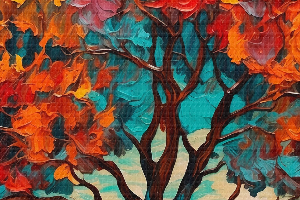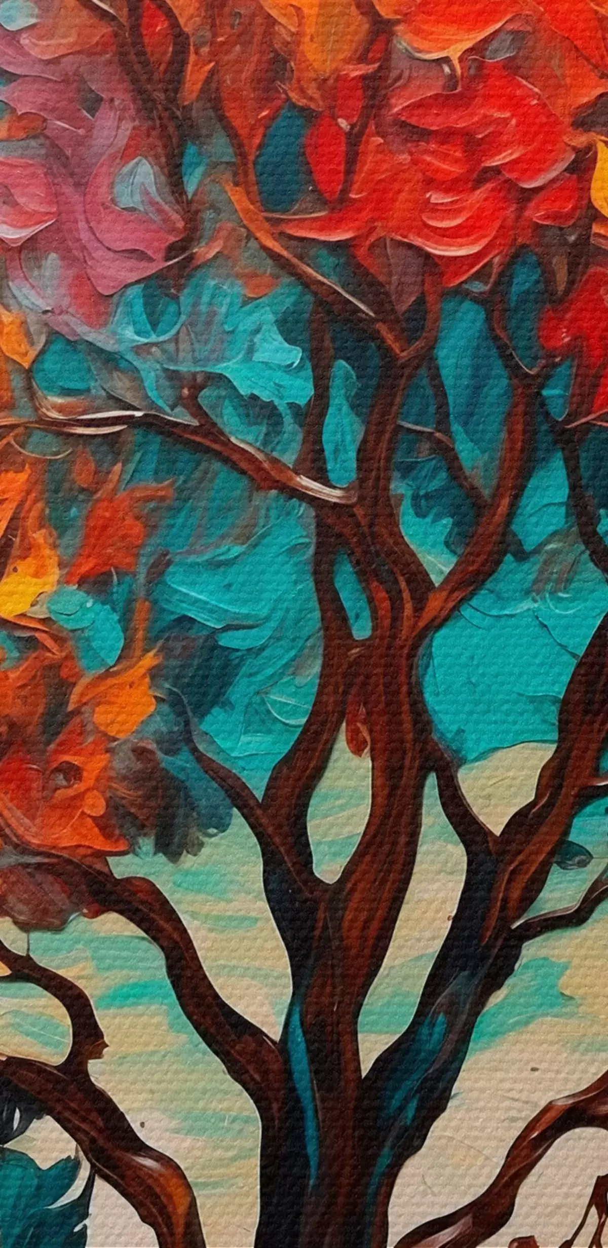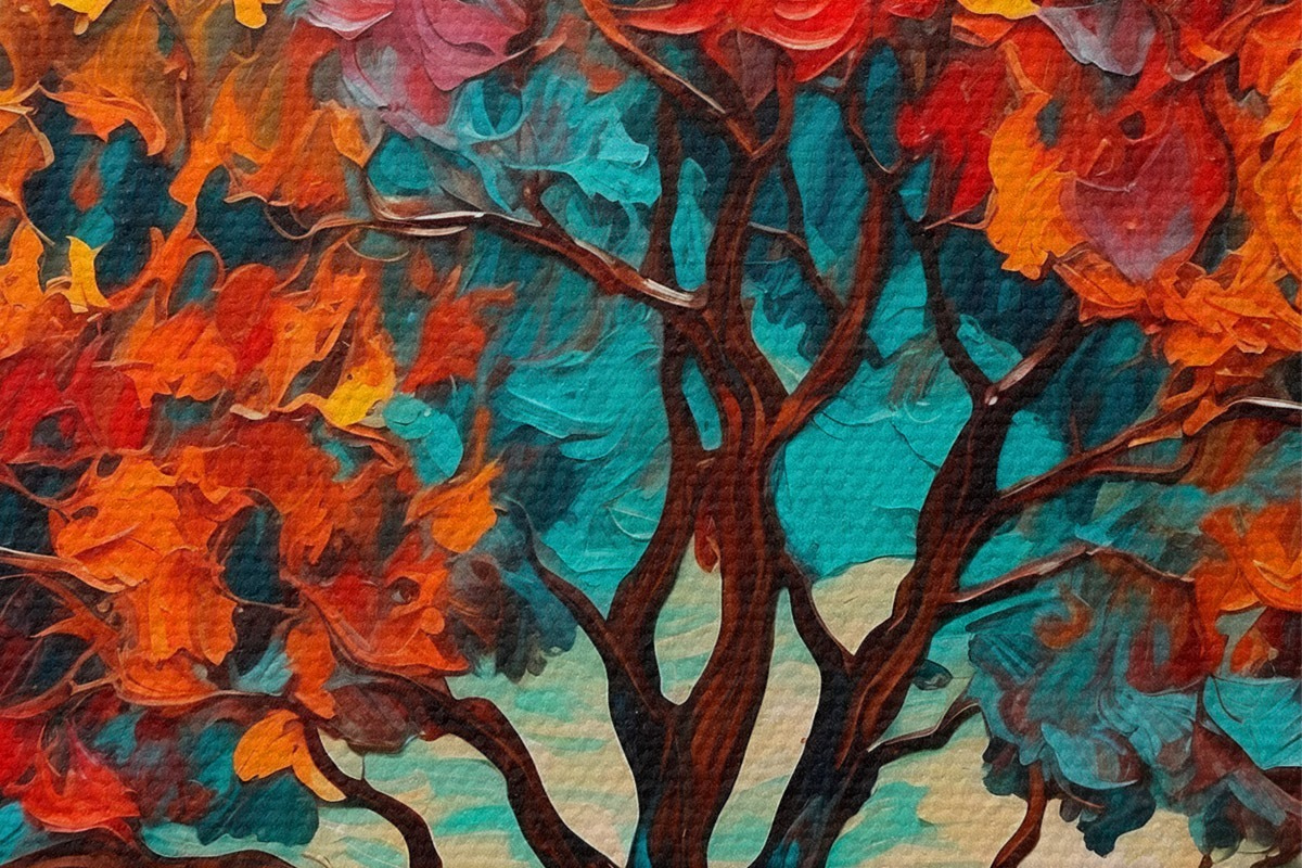 Immagine Albero su sfondo arancio-blu in stile pittura ad olio Nr r42267