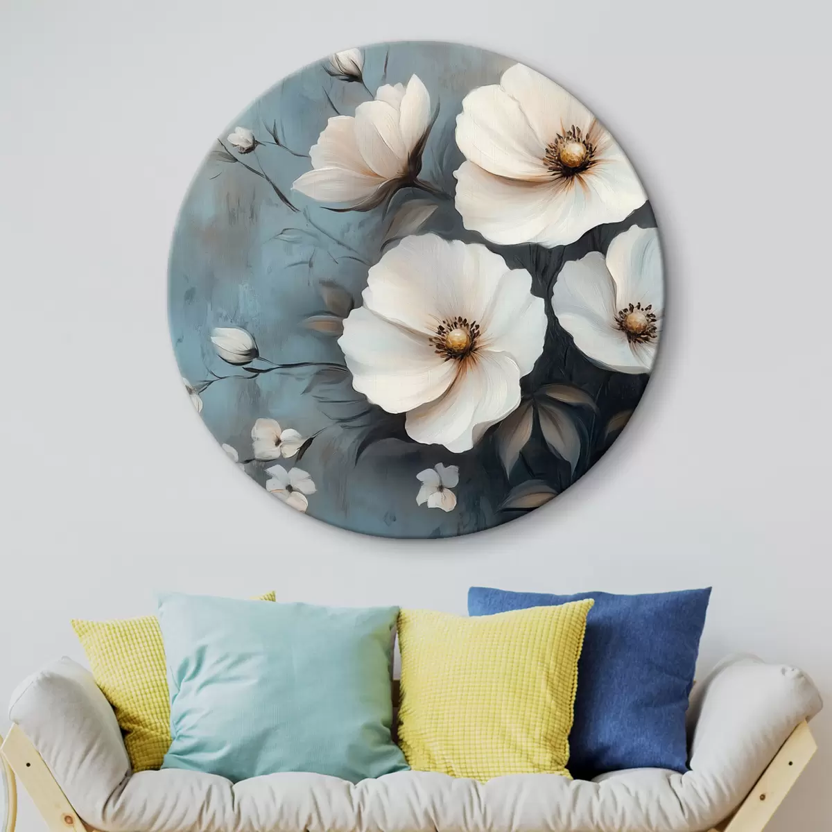 Quadri rotondi Fiori bianchi su sfondo blu r42319