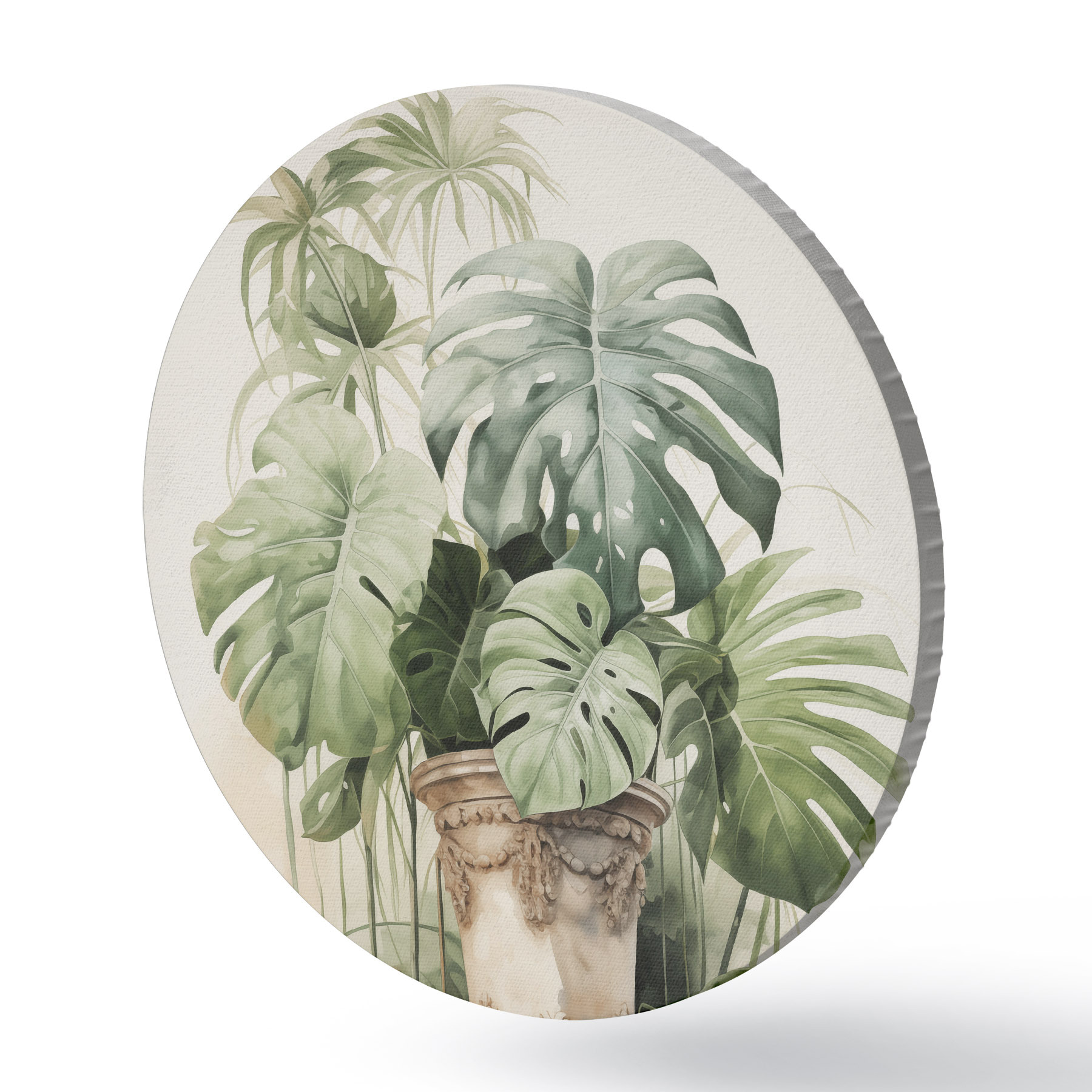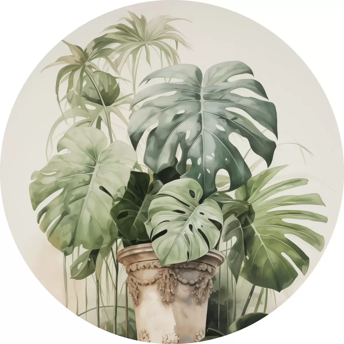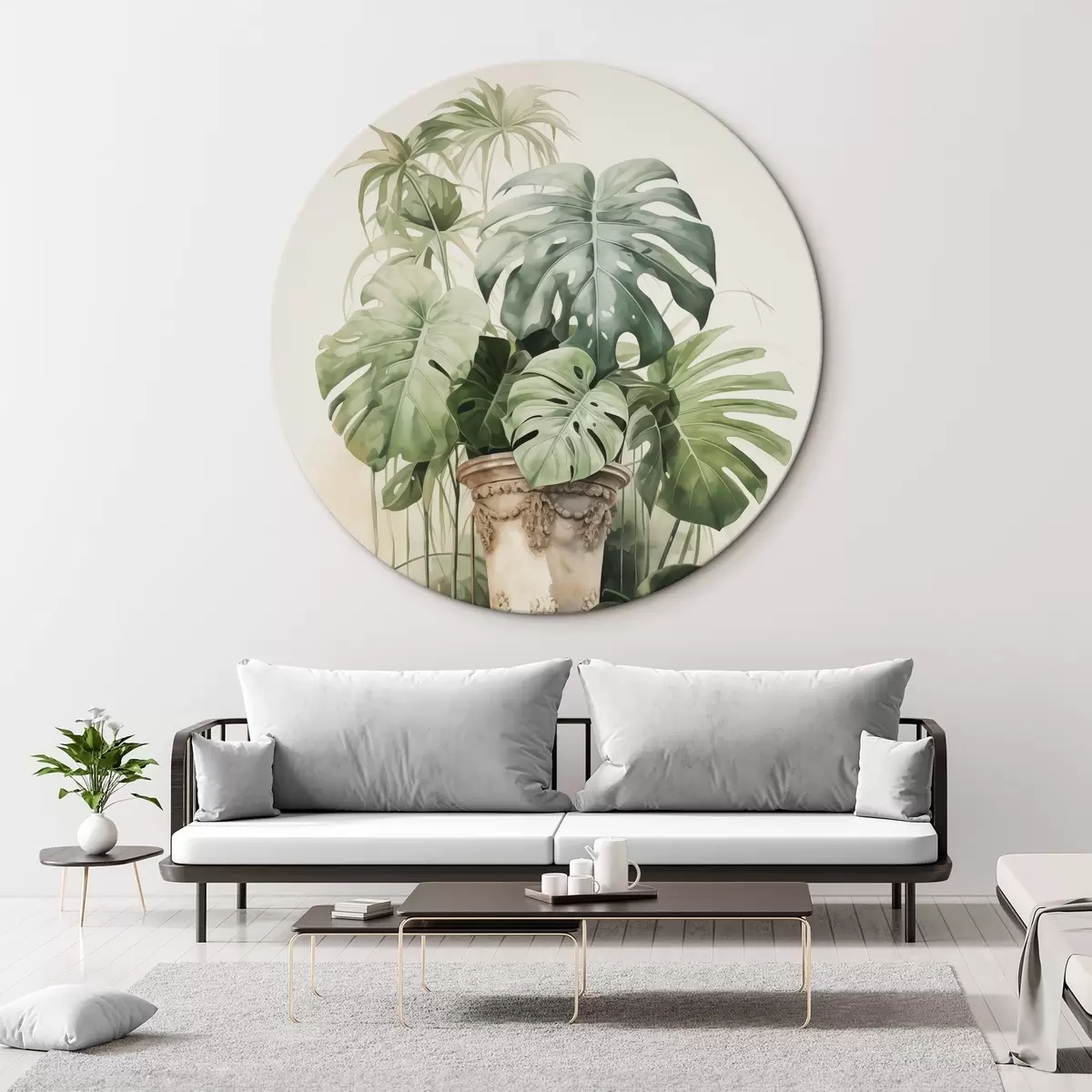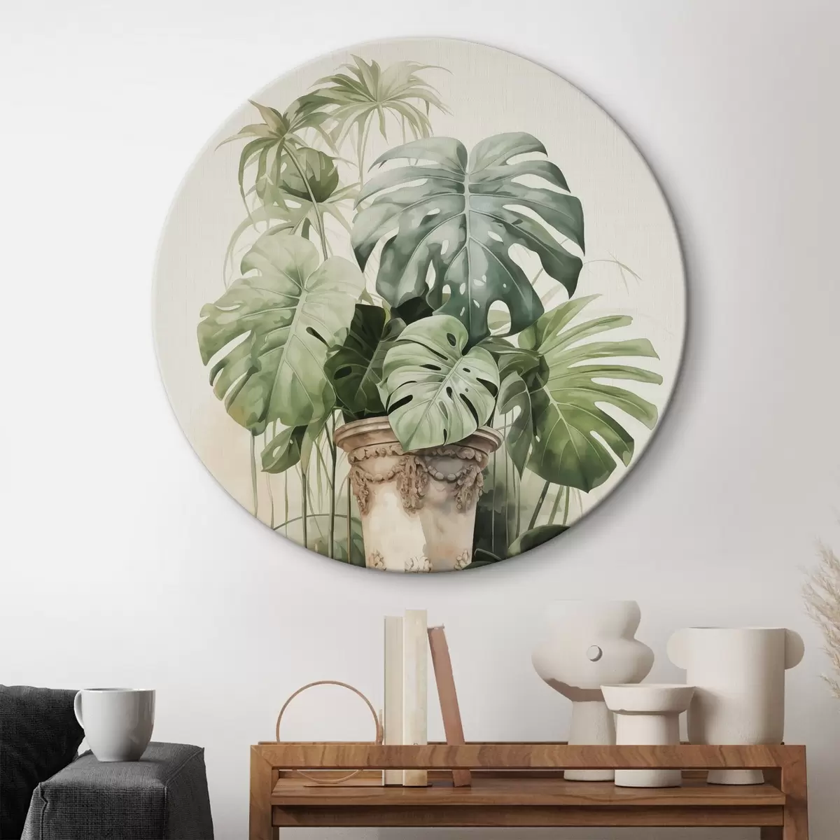 Quadri rotondi Foglie di monstera tropicale su colonna imitazione acquerello r42351