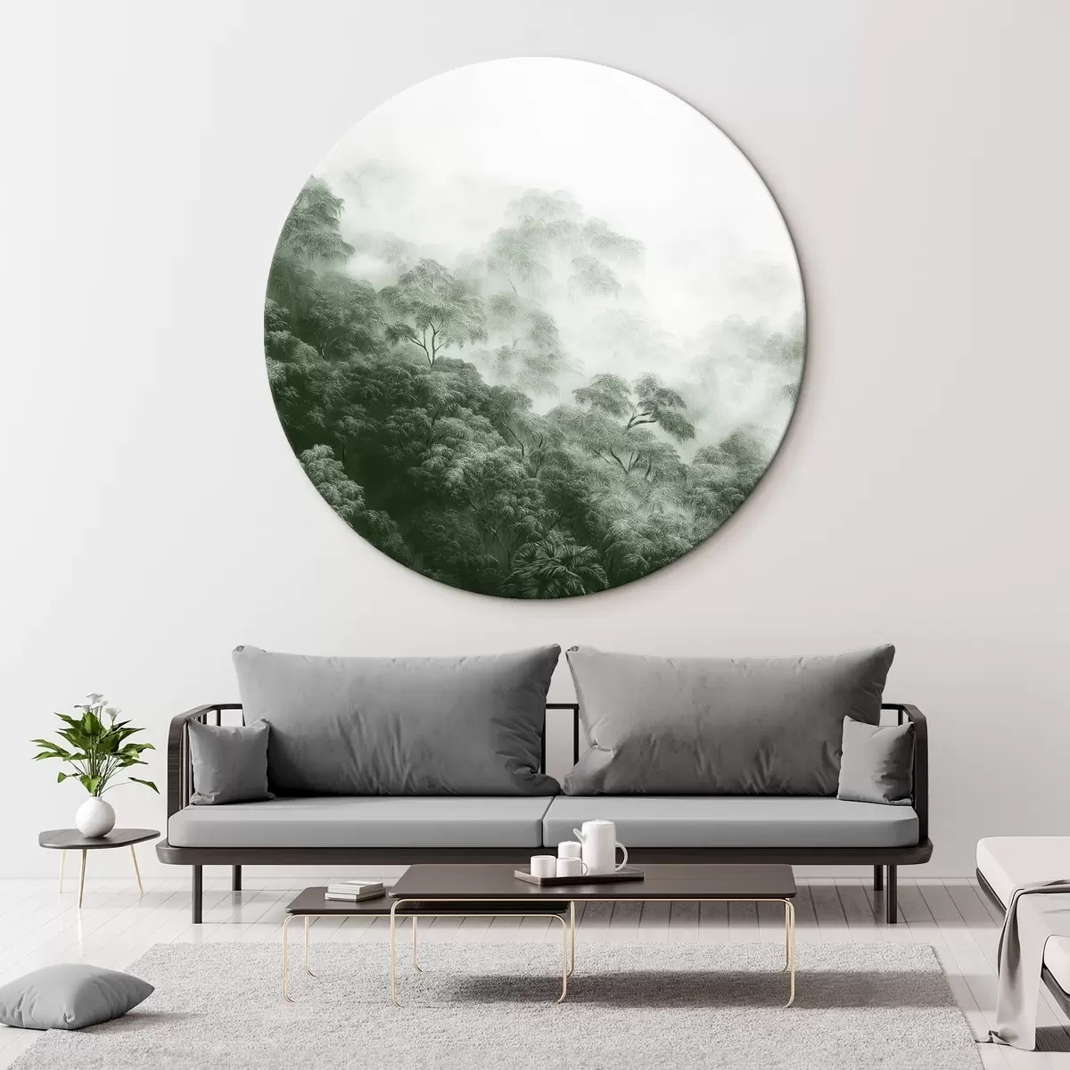 Quadri rotondi Foresta tropicale nella nebbia, palme, colori verdi r42371