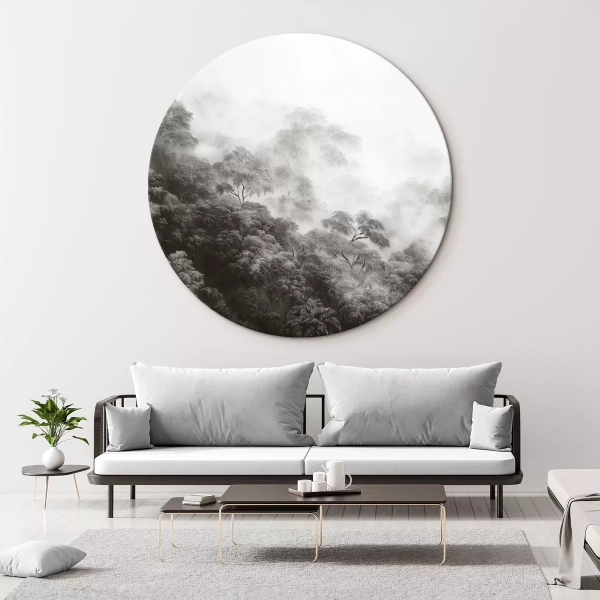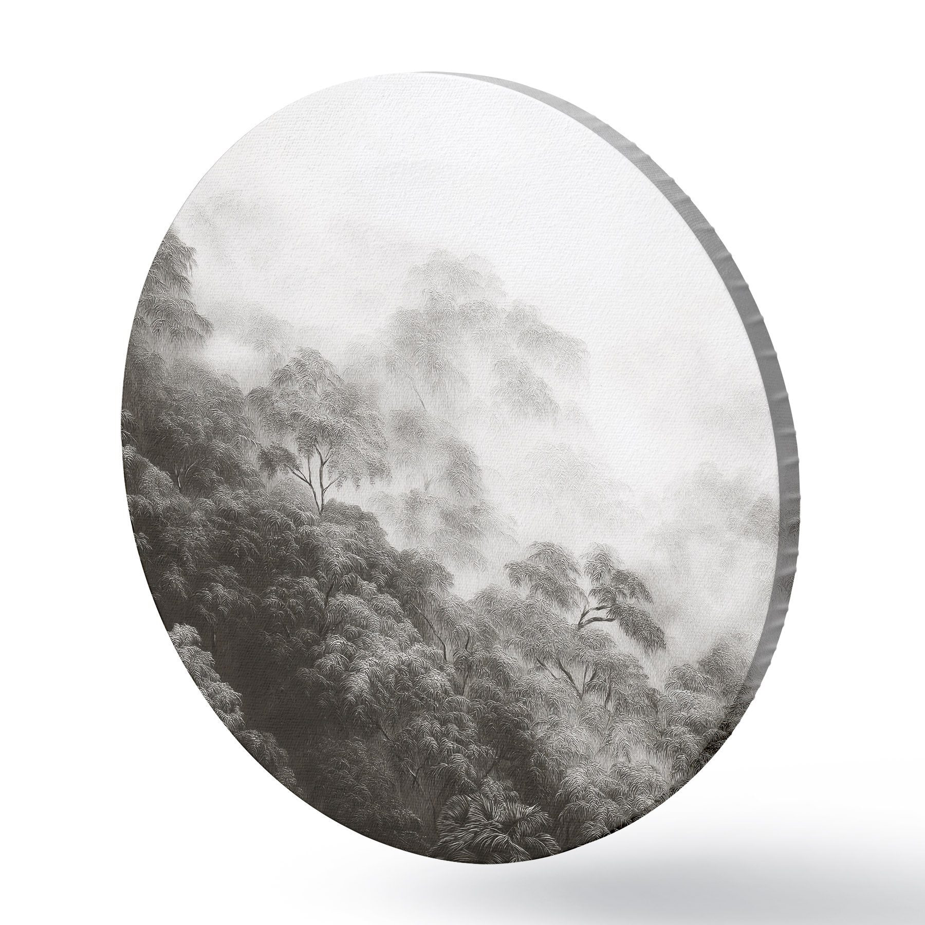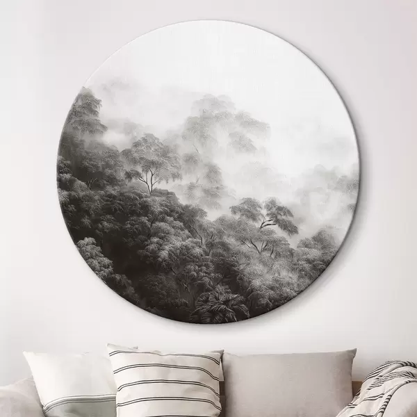 Quadri rotondi Foresta tropicale nella nebbia, palme, colori grigi r42371v1