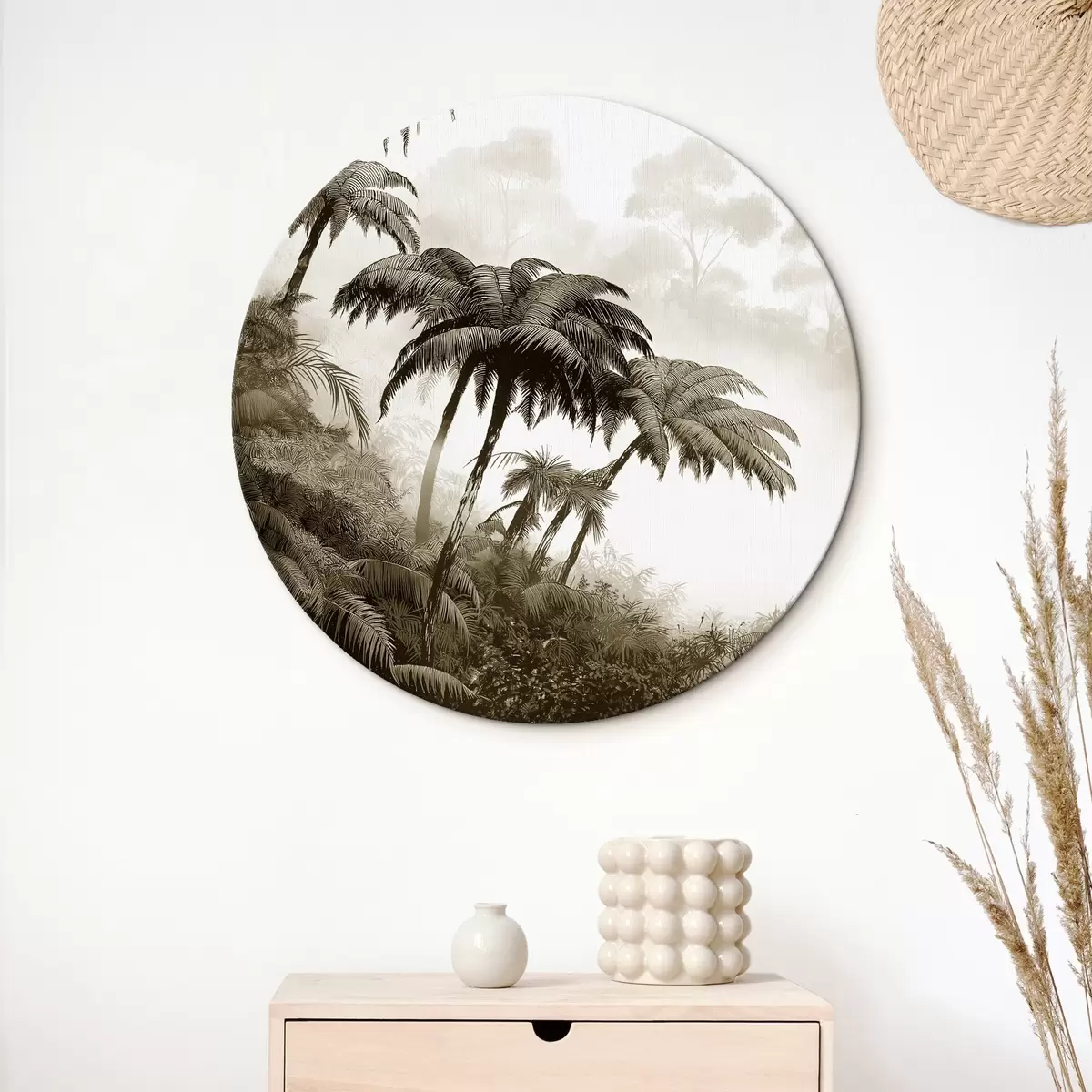 Quadri rotondi Foresta della giungla nella nebbia, palme, natura, colori beige r42372