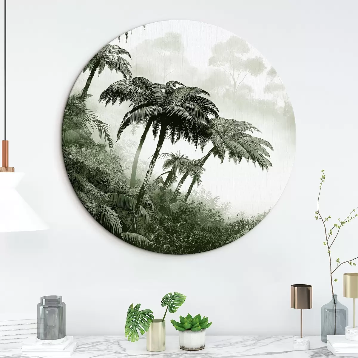 Quadri rotondi Foresta della giungla nella nebbia, palme, natura, colori verdi r42372v1