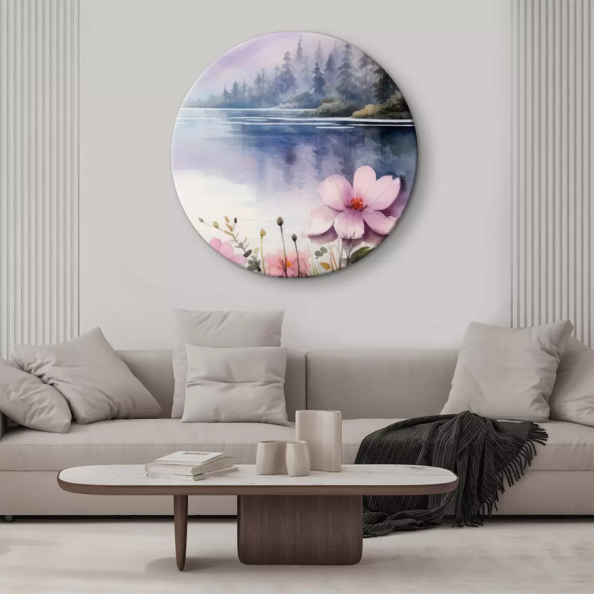 Quadri rotondi Fiori rosa sullo sfondo di un lago in montagna r42393