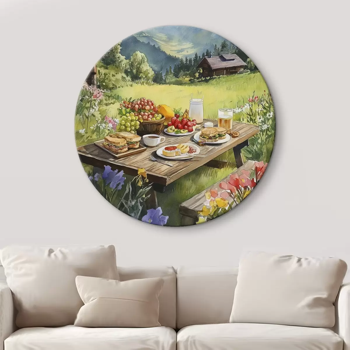 Quadri rotondi Paesaggi di montagna, prato estivo, case di legno, colazione r42425
