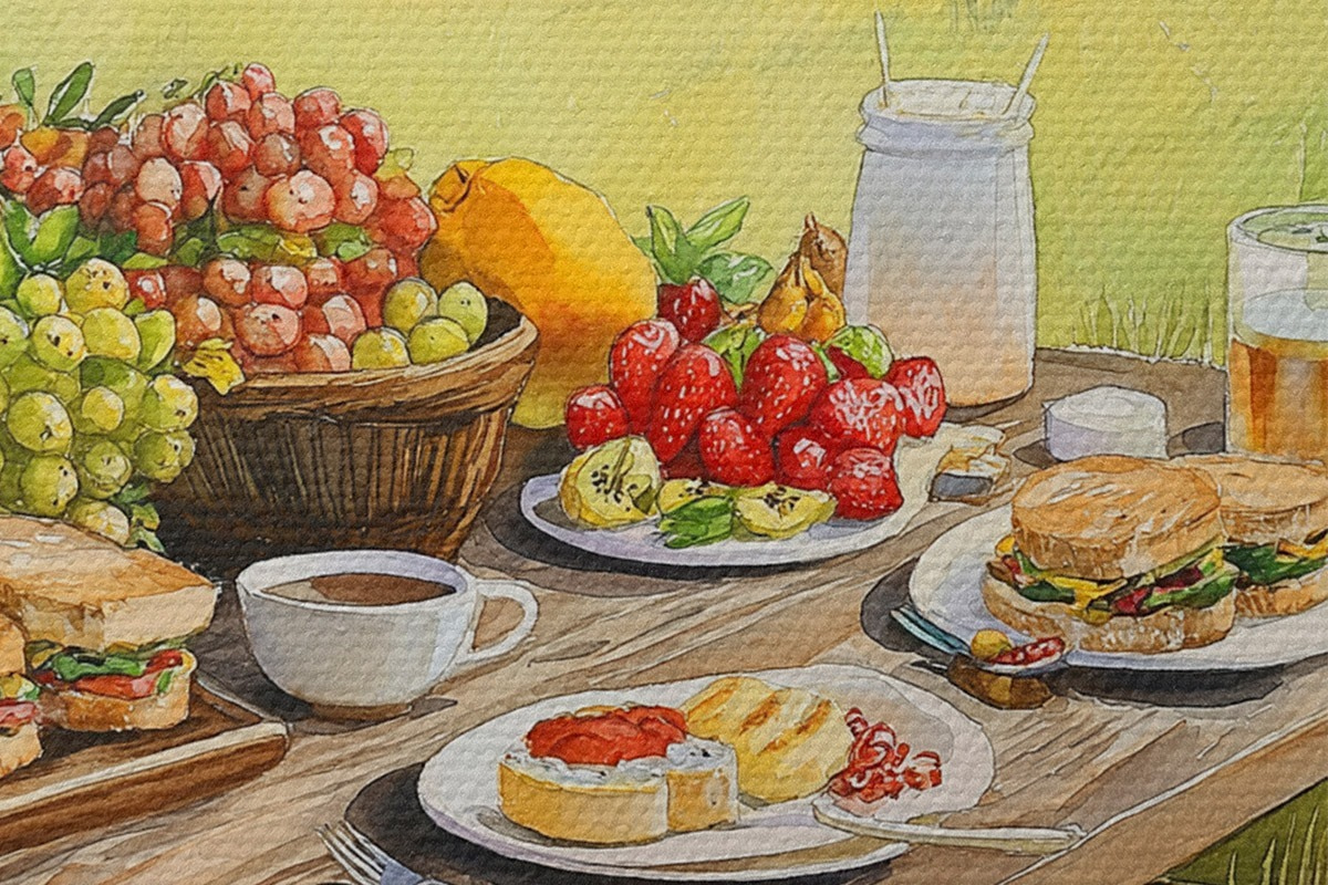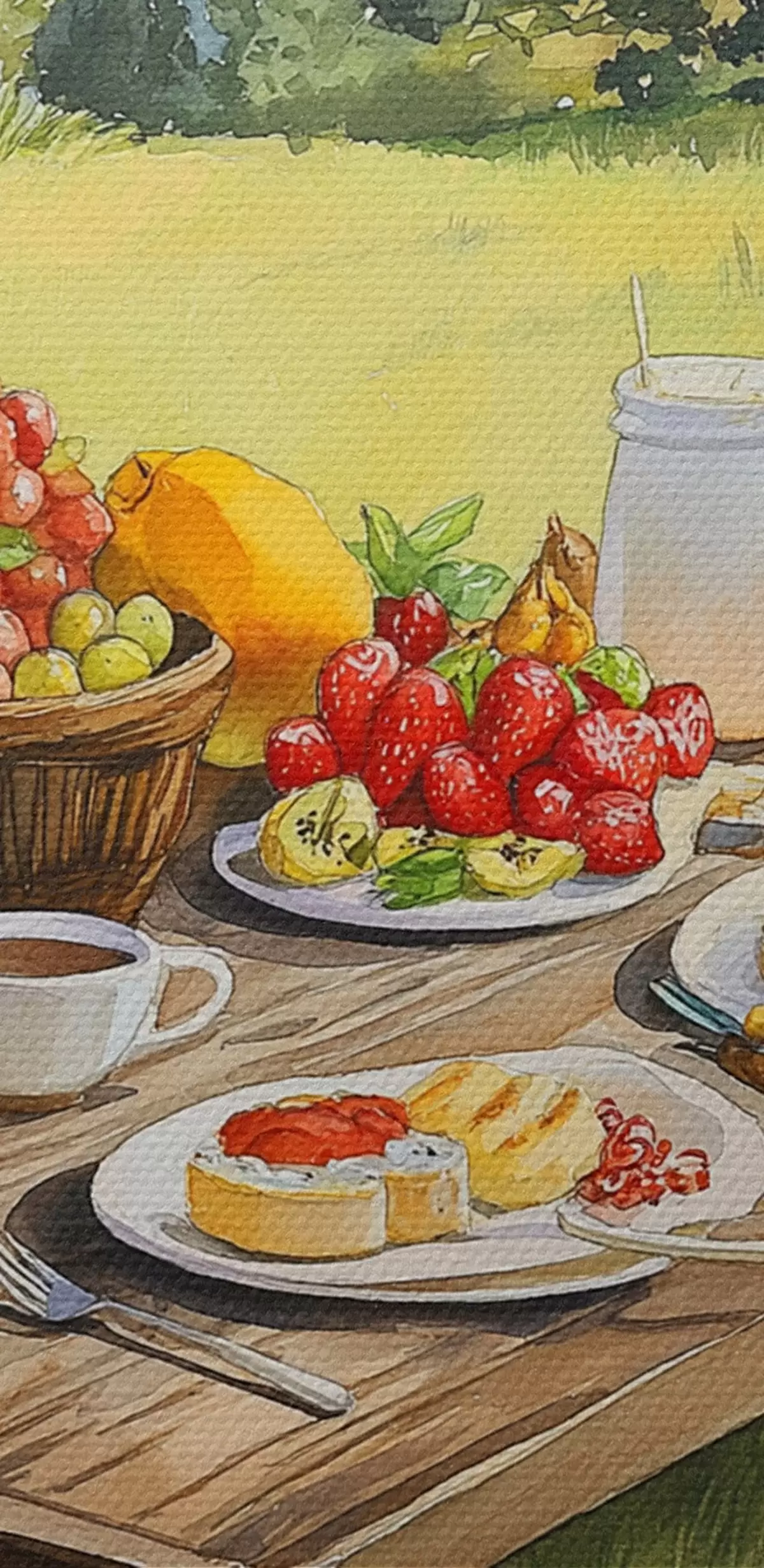 Immagine Paesaggi di montagna, prato estivo, case di legno, colazione Nr r42425
