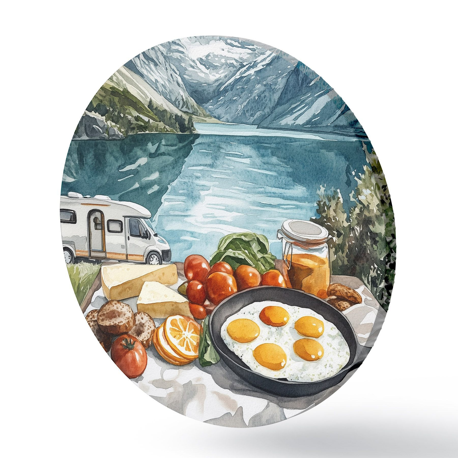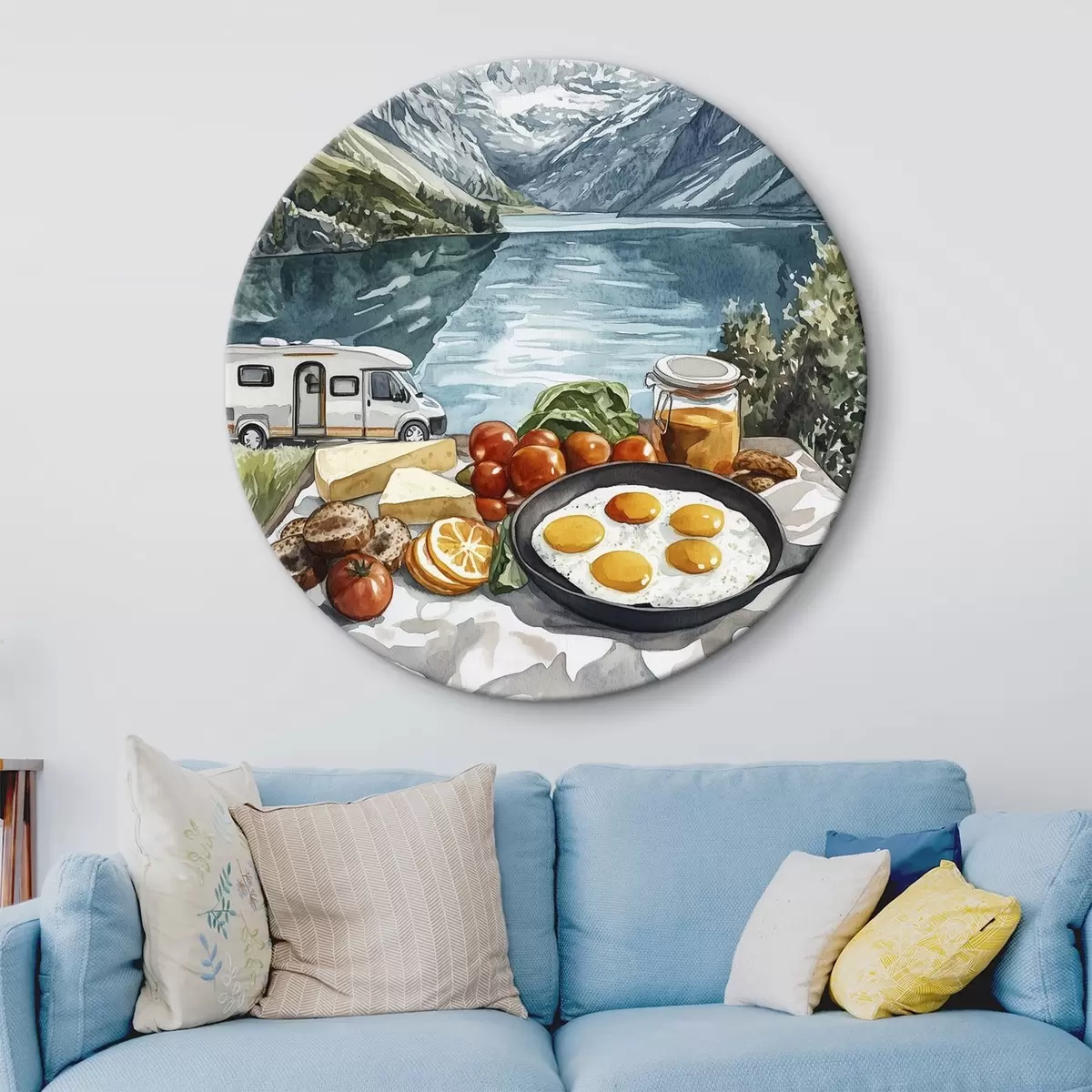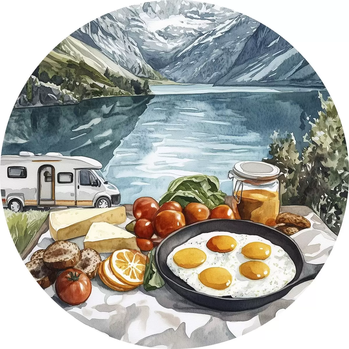 Quadri rotondi Viaggi, paesaggi naturali, stile acquerello, Norvegia, colazione, furgone r42431