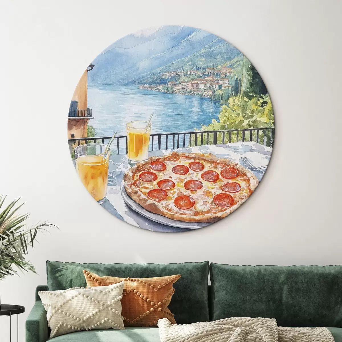 Quadri rotondi Brunch in Italia, stile acquerello, pizza margarita, lago, natura estiva r42436