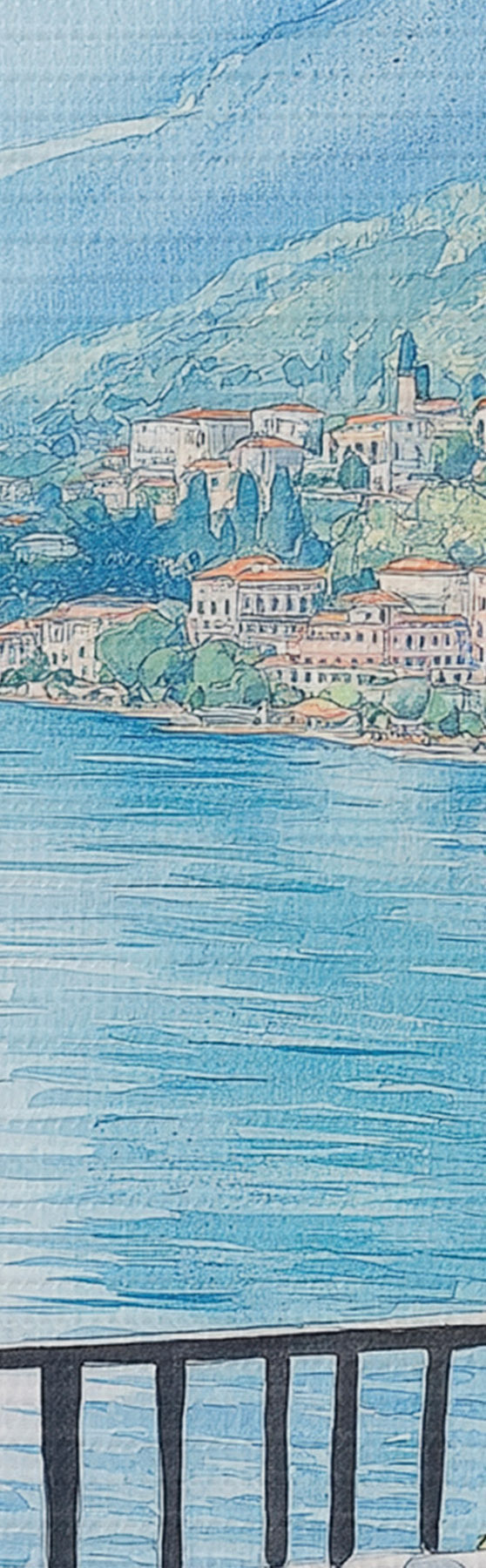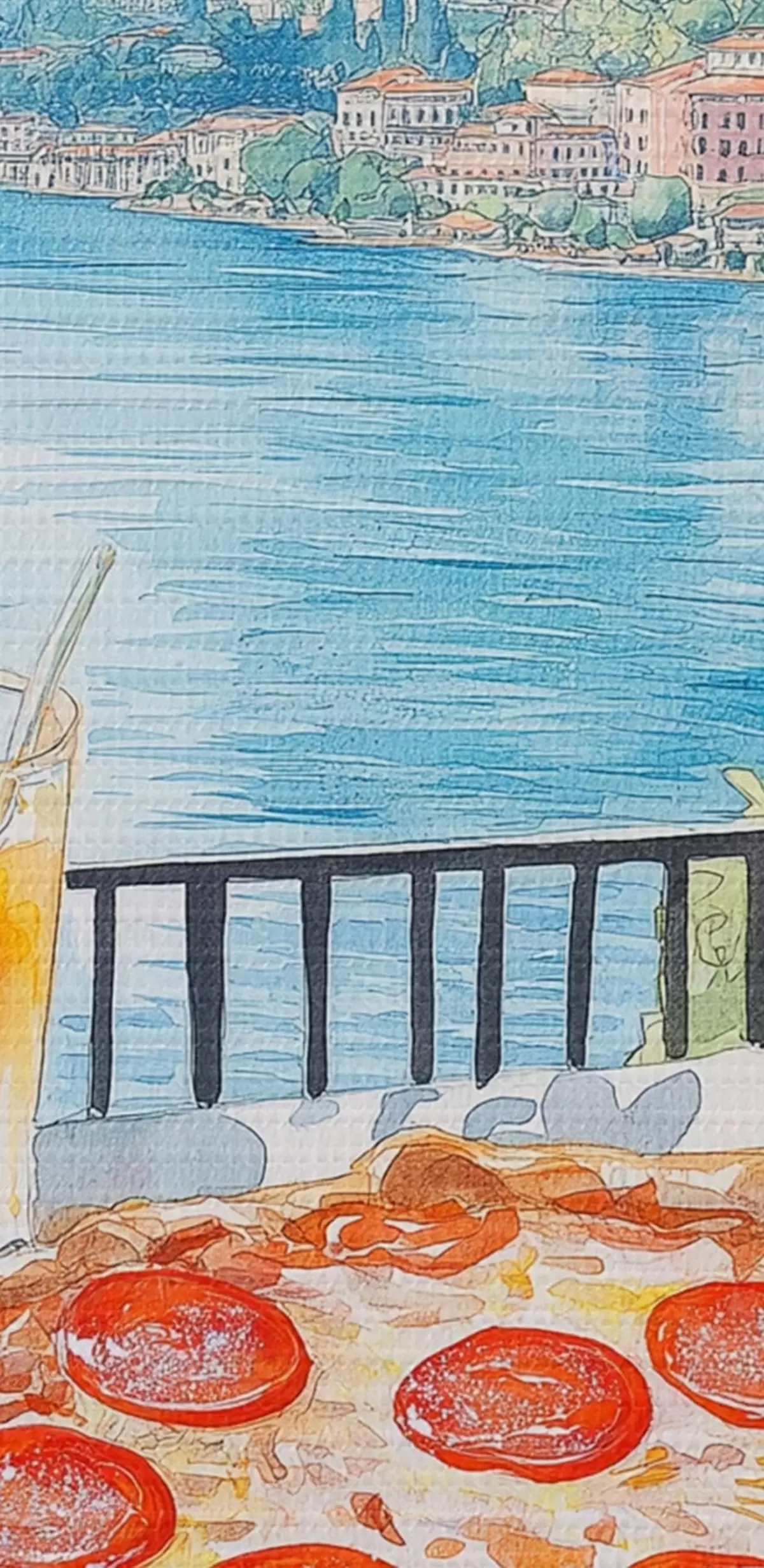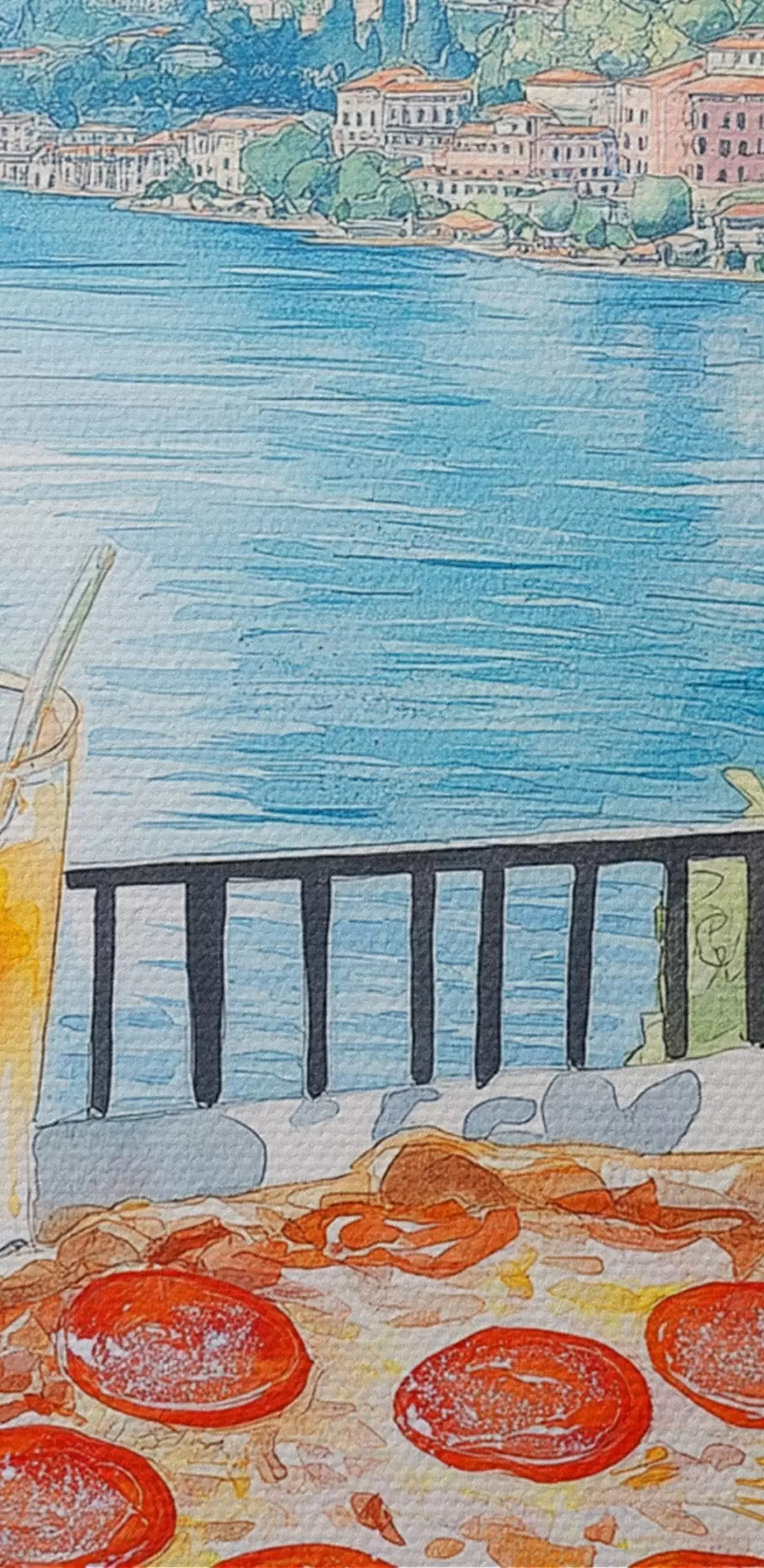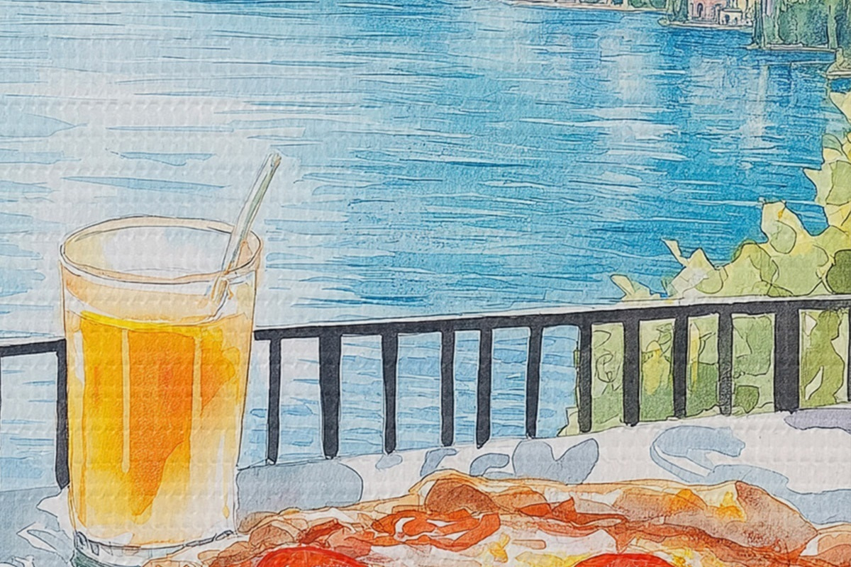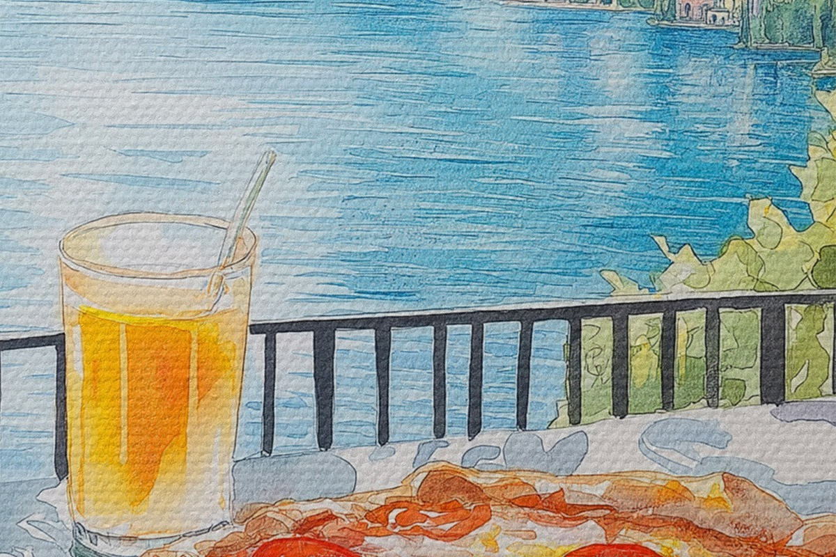 Immagine Brunch in Italia, stile acquerello, pizza margarita, lago, natura estiva Nr r42436