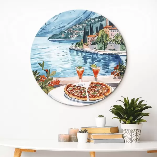 Quadri rotondi Lago di Como, Italia, stile acquerello, pizza, cocktail, città vecchia, montagne r42437