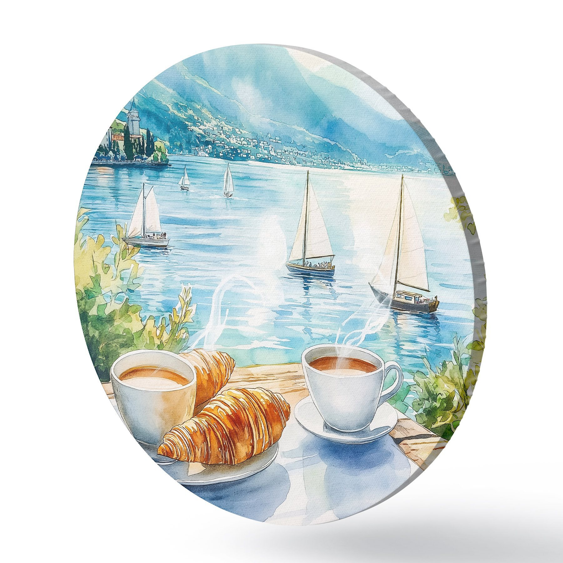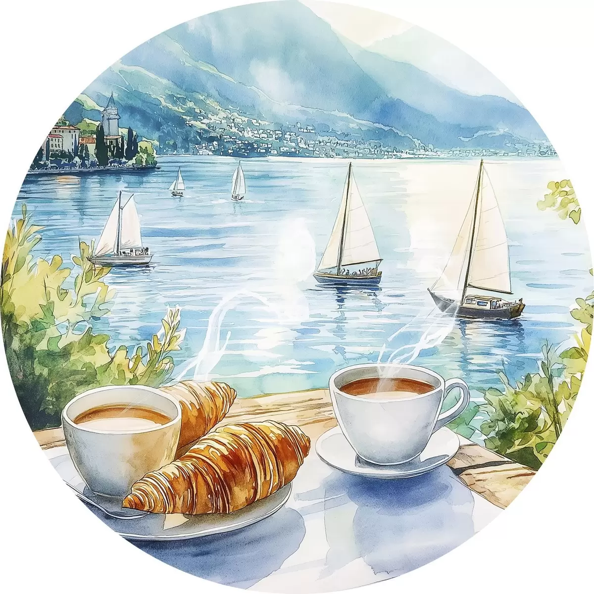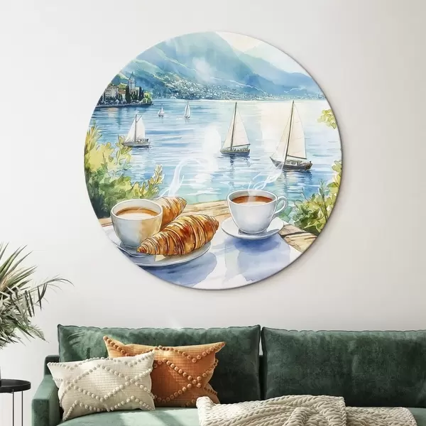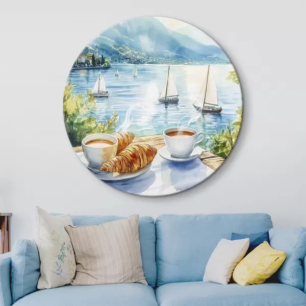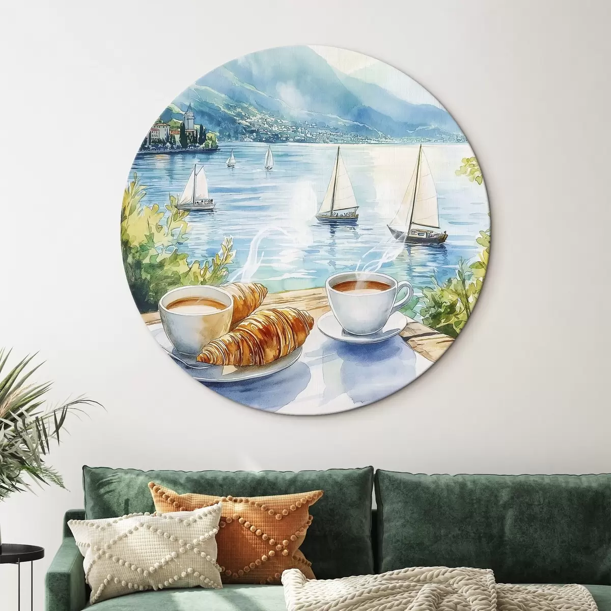 Quadri rotondi Lago estivo con barche a vela, tazze di caffè, croissant, stile acquerello r42441