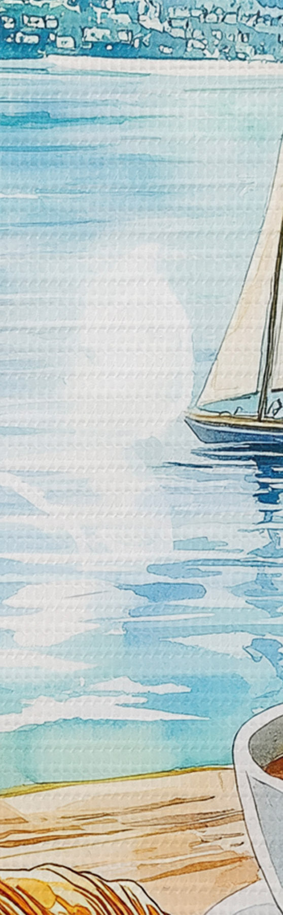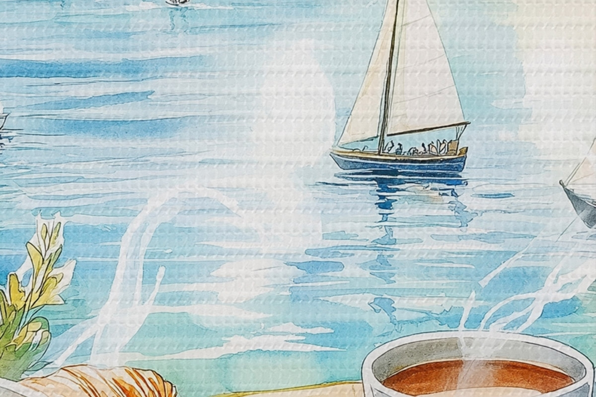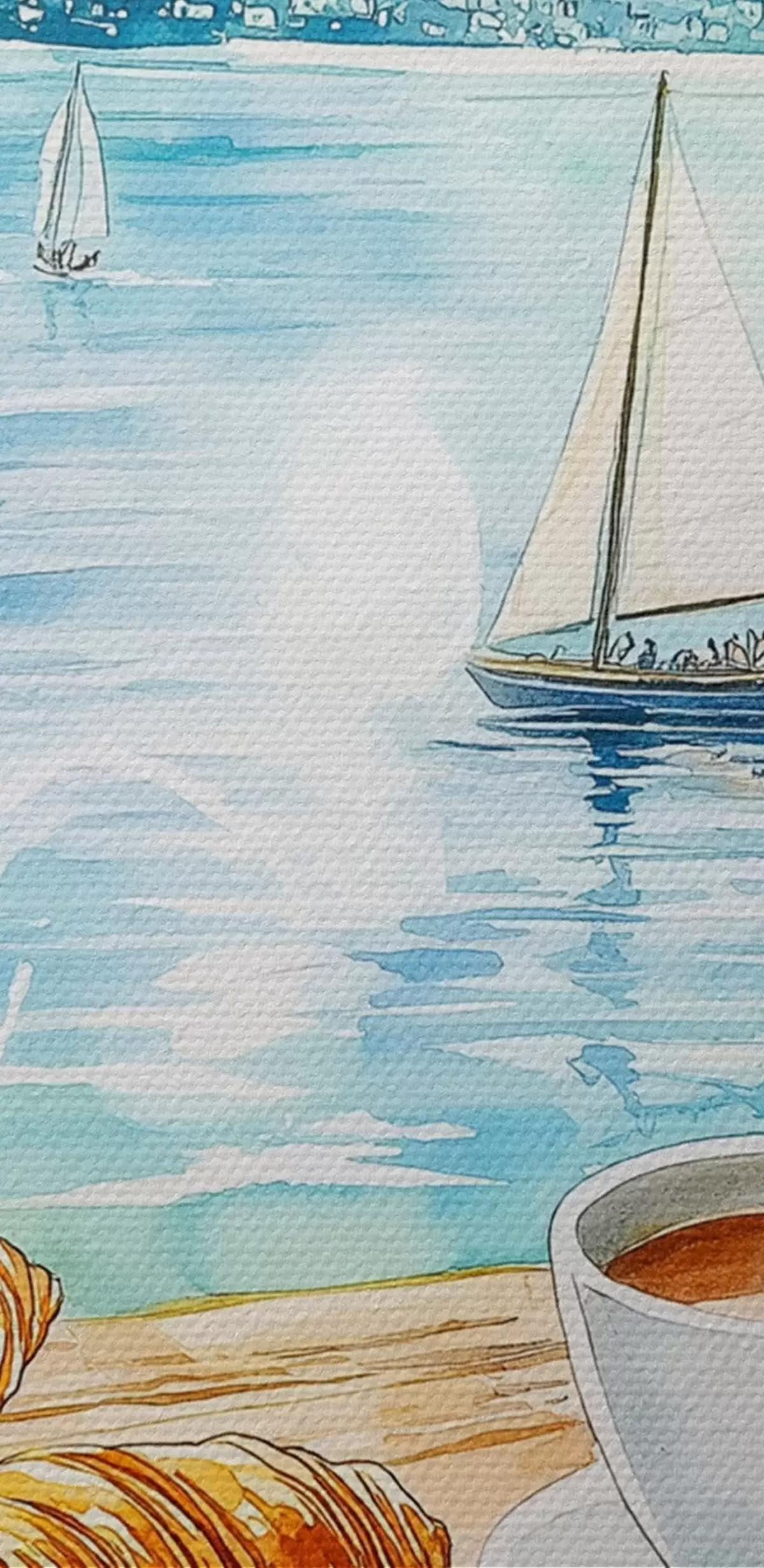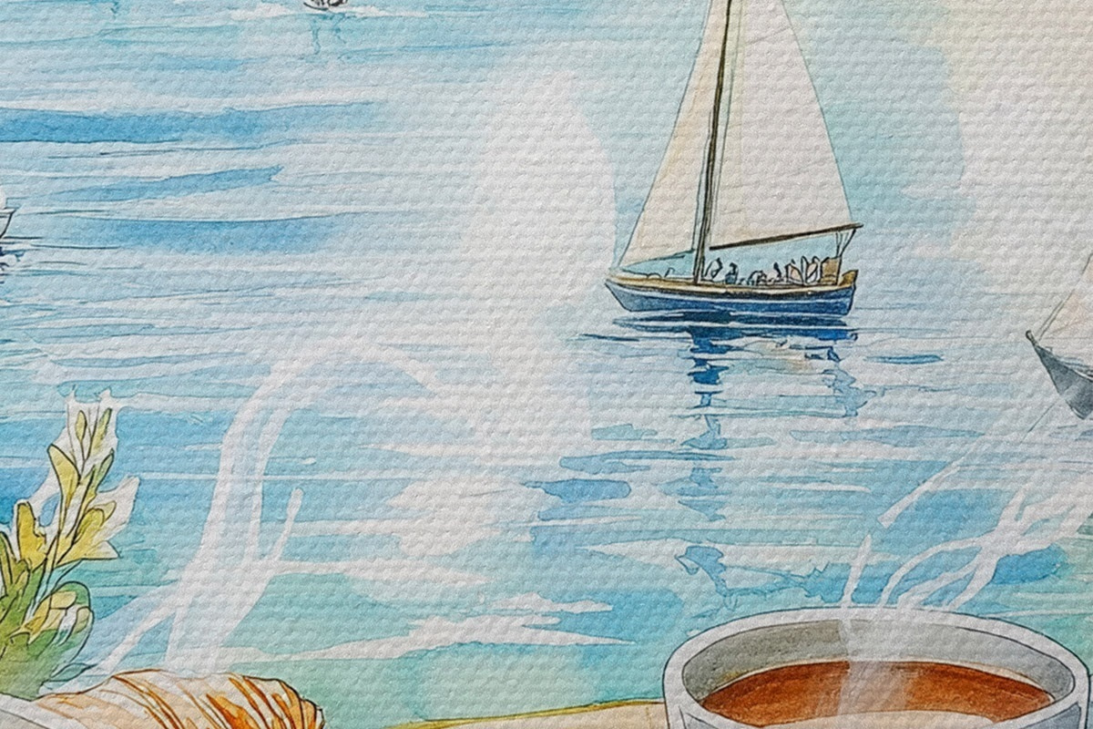 Immagine Lago estivo con barche a vela, tazze di caffè, croissant, stile acquerello Nr r42441