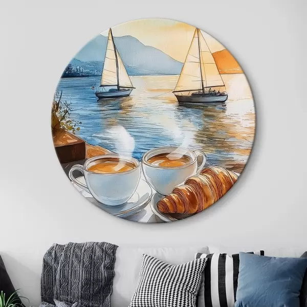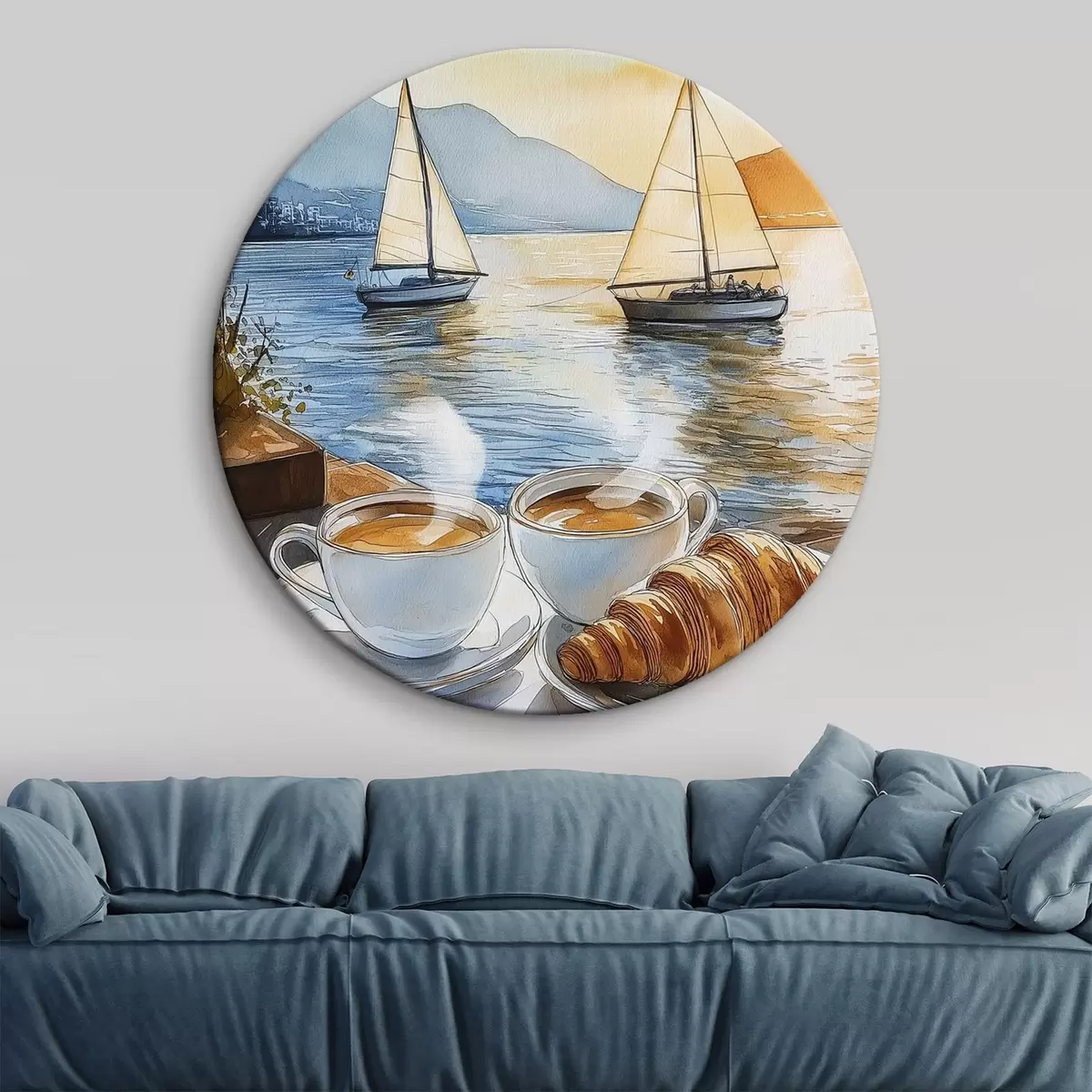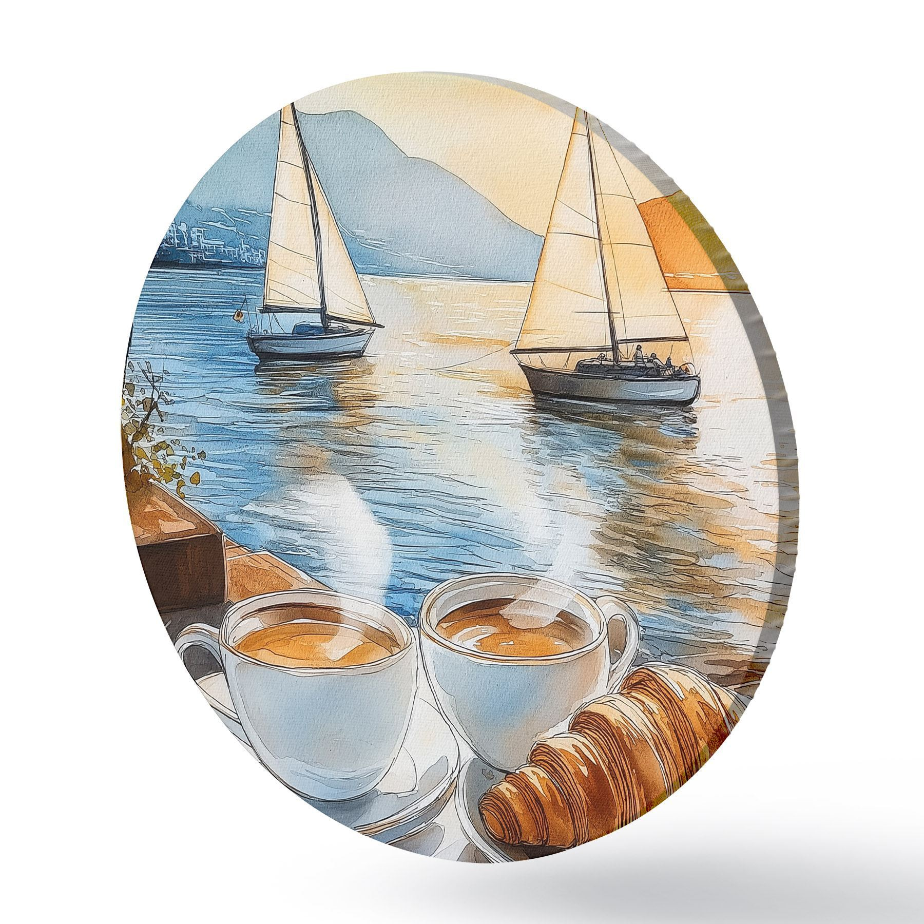 Quadri rotondi Tramonto sul lago, barche a vela, tazze di caffè, stile acquerello r42442
