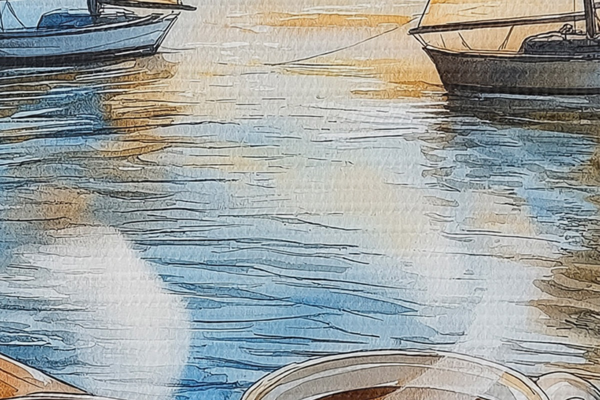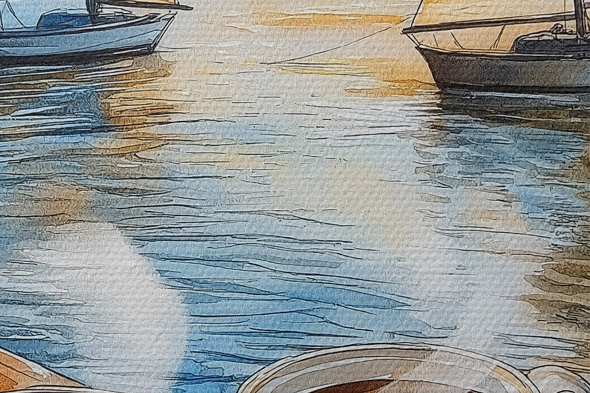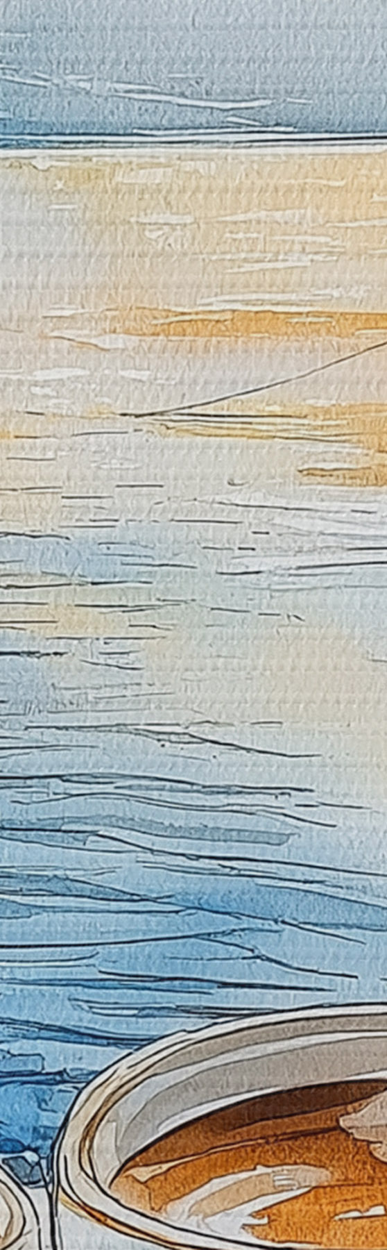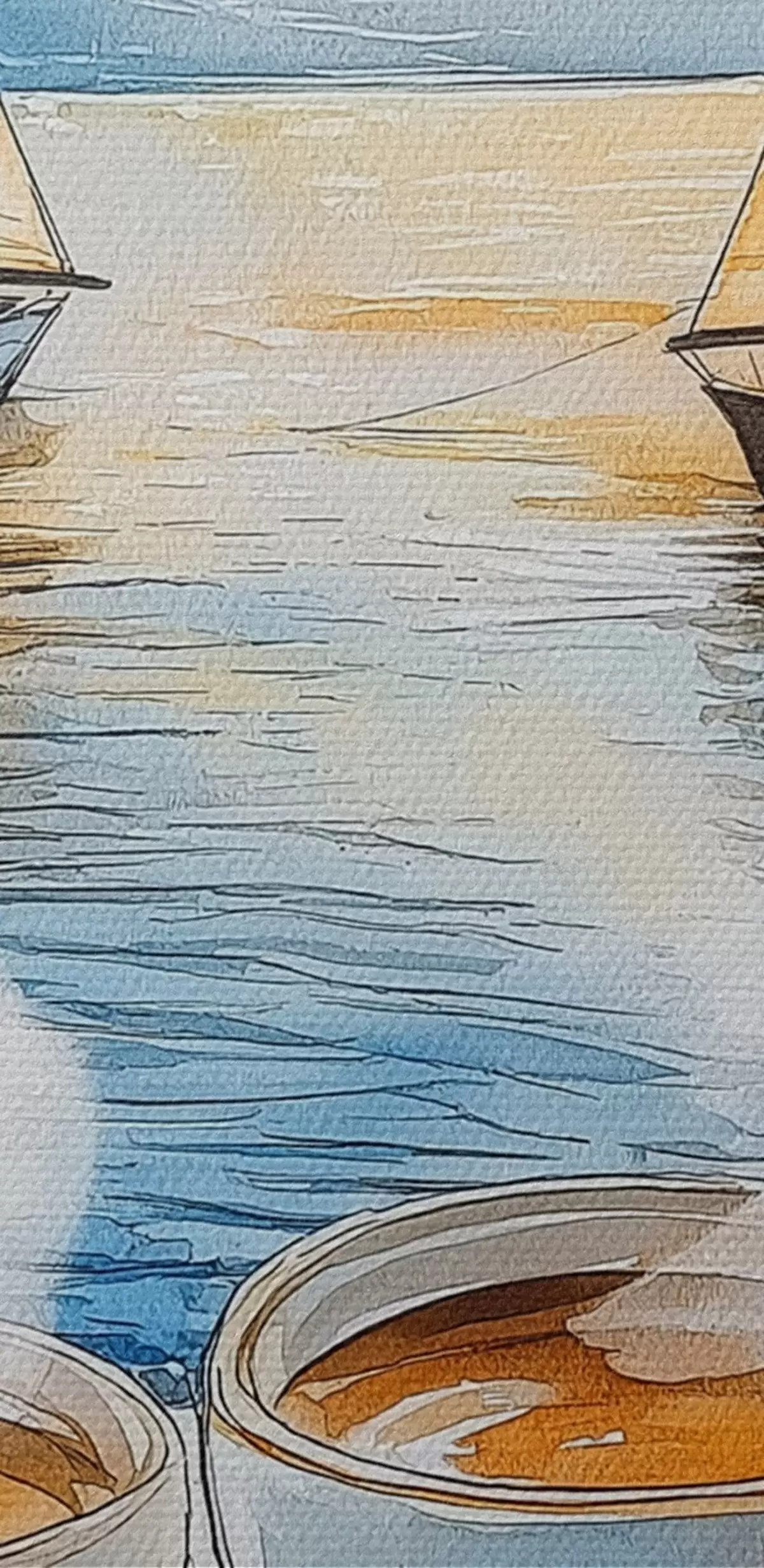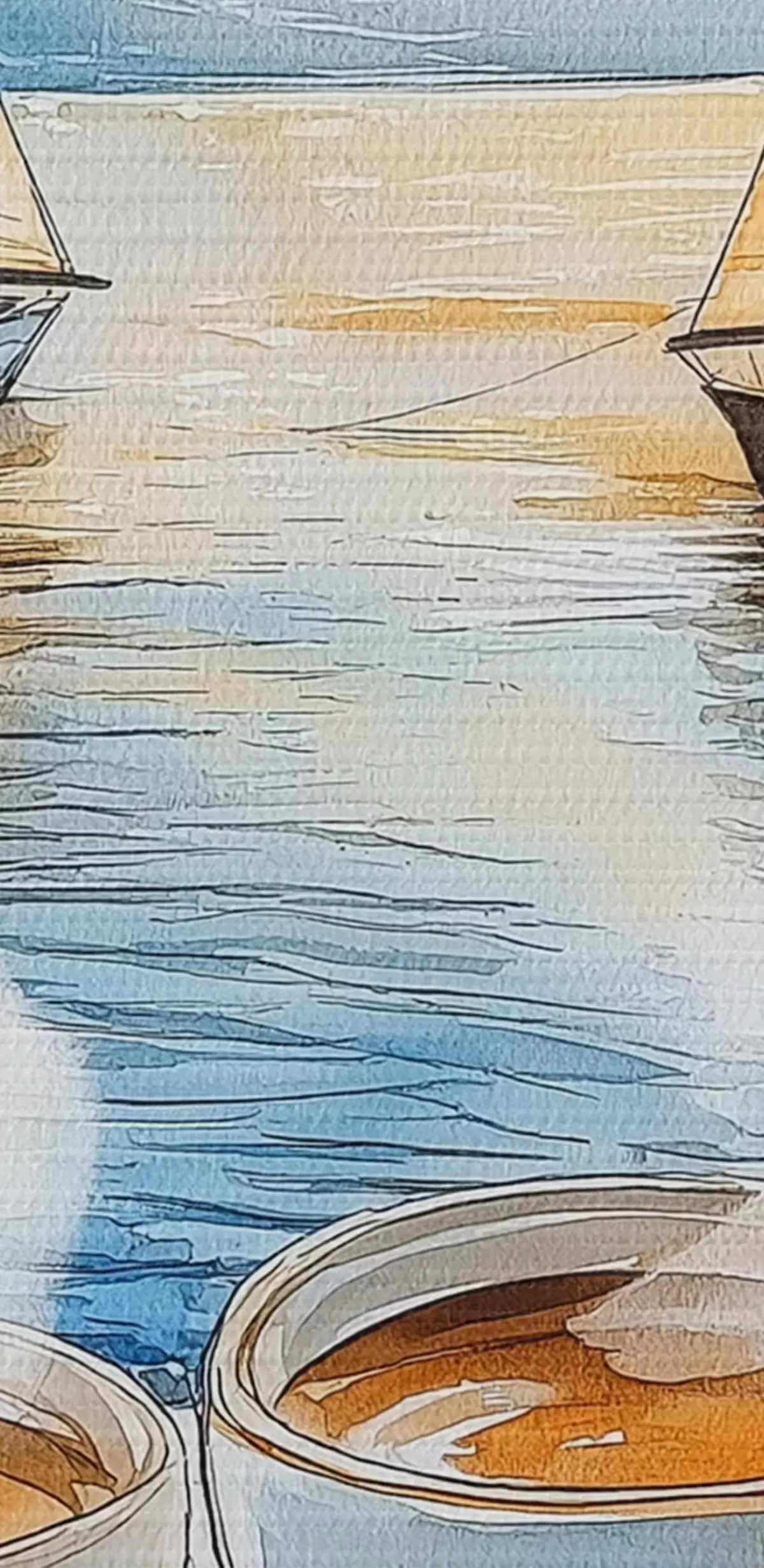 Immagine Tramonto sul lago, barche a vela, tazze di caffè, stile acquerello Nr r42442