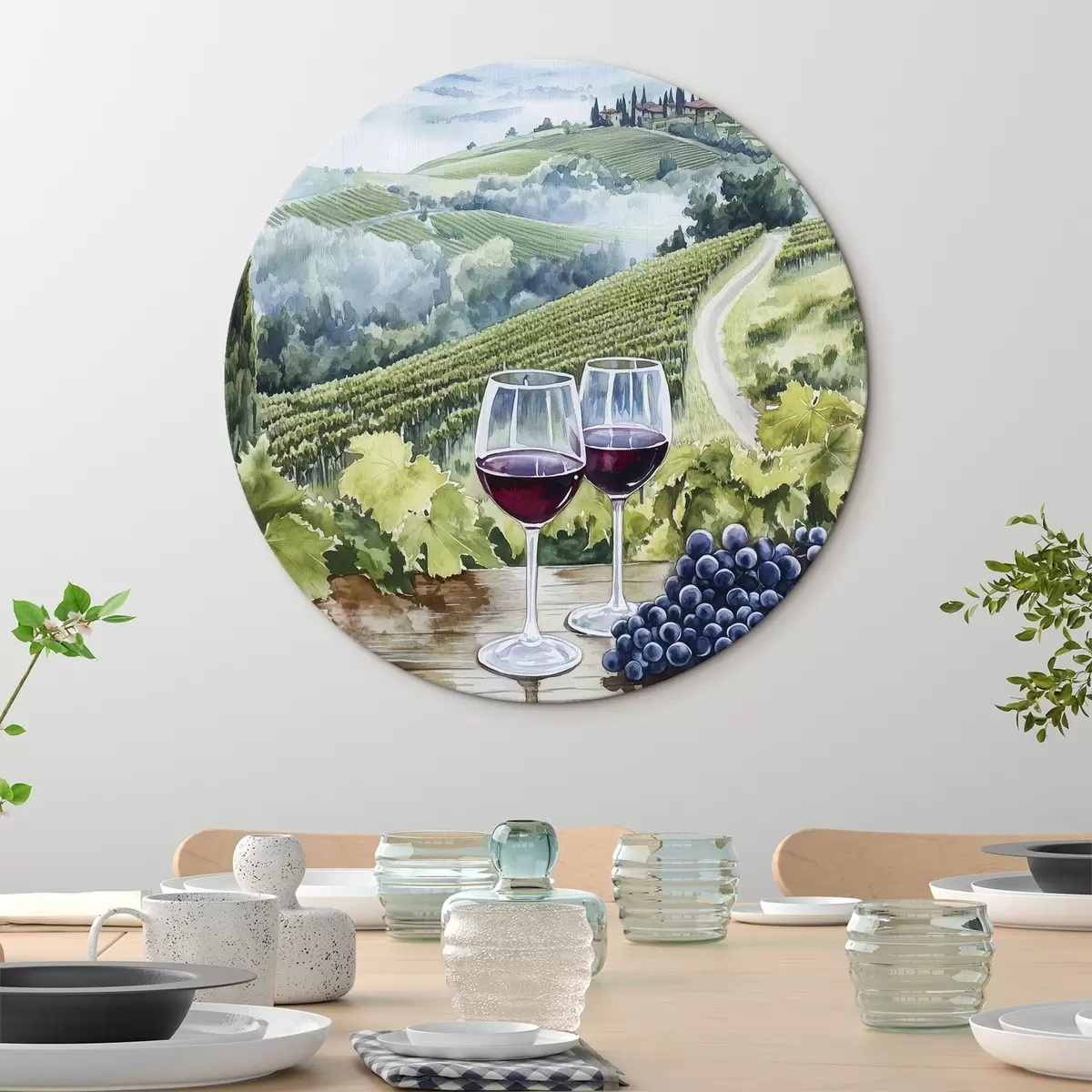Quadri rotondi Paesaggio toscano, cantieri d'uva, bicchieri di vino, stile acquerello r42445