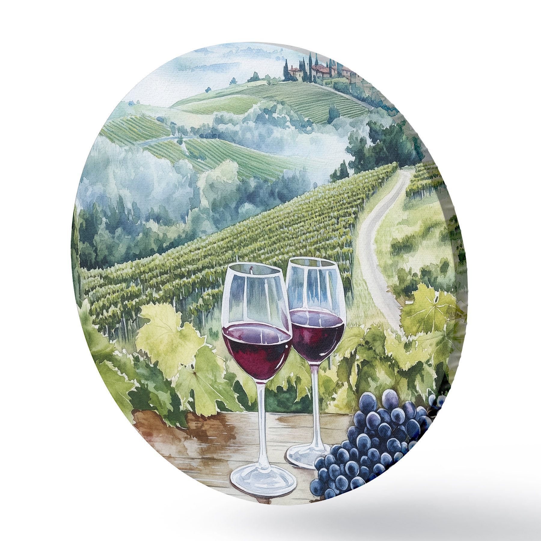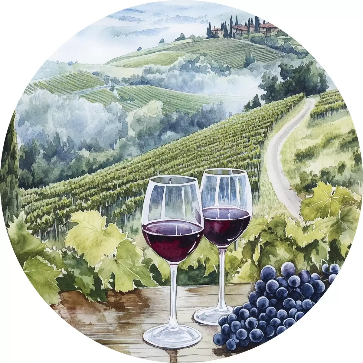 Quadri rotondi Paesaggio toscano, cantieri d'uva, bicchieri di vino, stile acquerello r42445