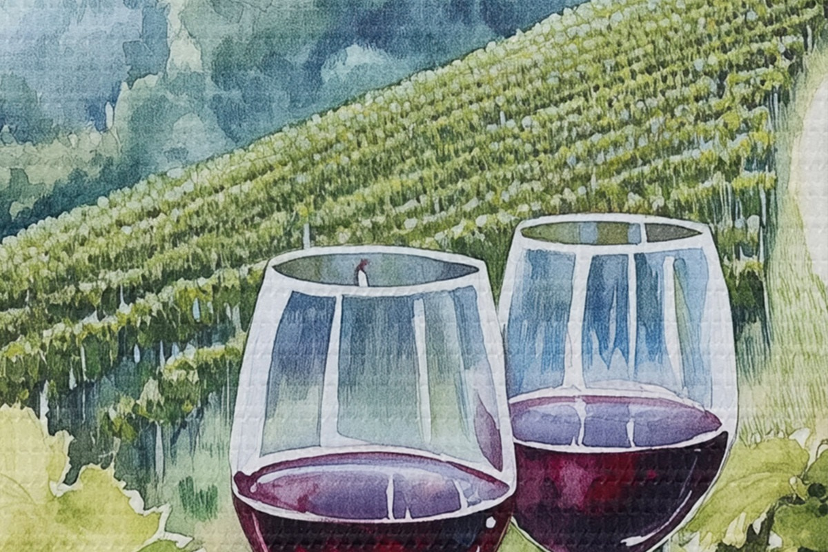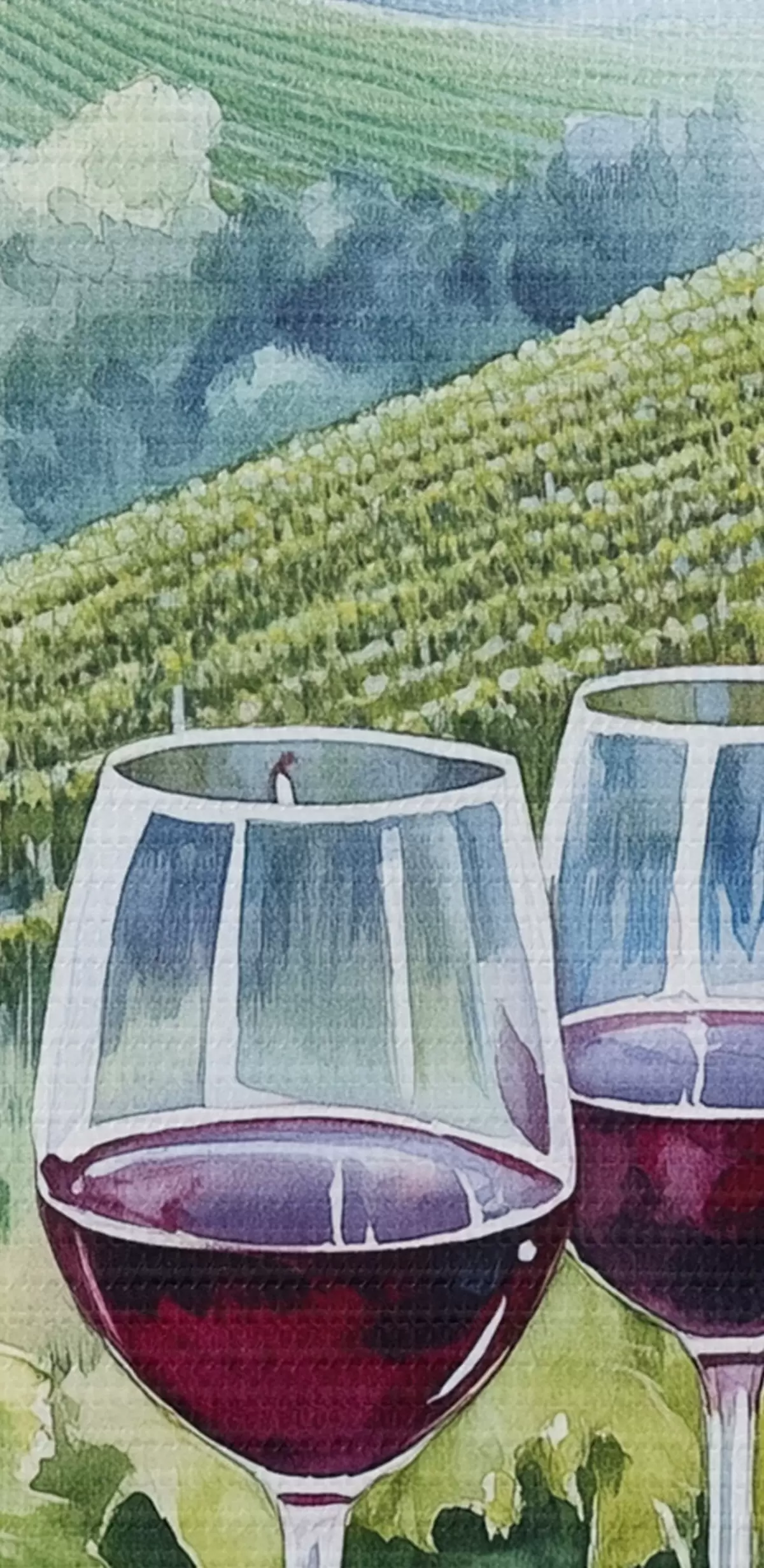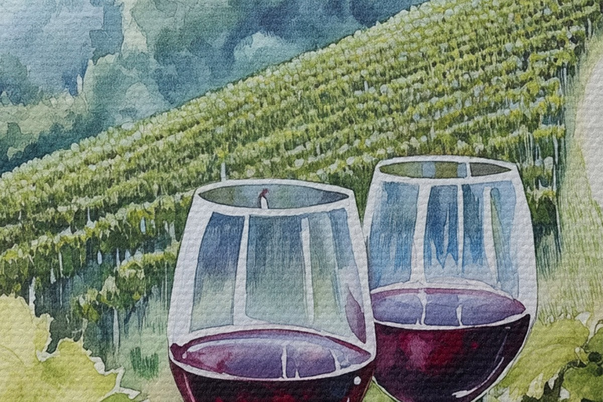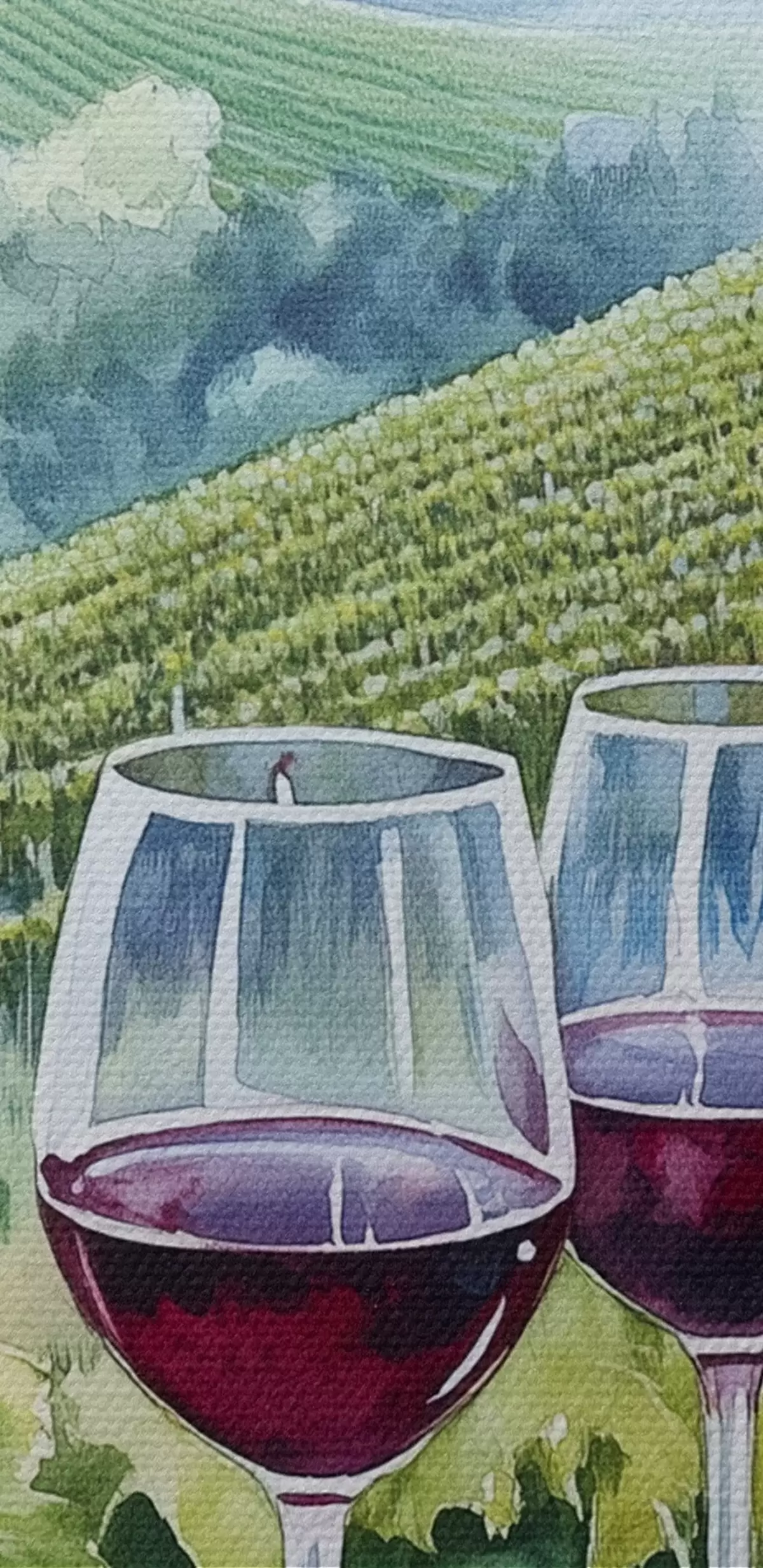 Immagine Paesaggio toscano, cantieri d'uva, bicchieri di vino, stile acquerello Nr r42445
