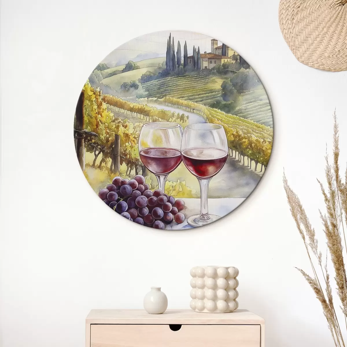 Quadri rotondi Tramonto in Toscana, cantina, architettura antica, stile acquerello, Italia r42446