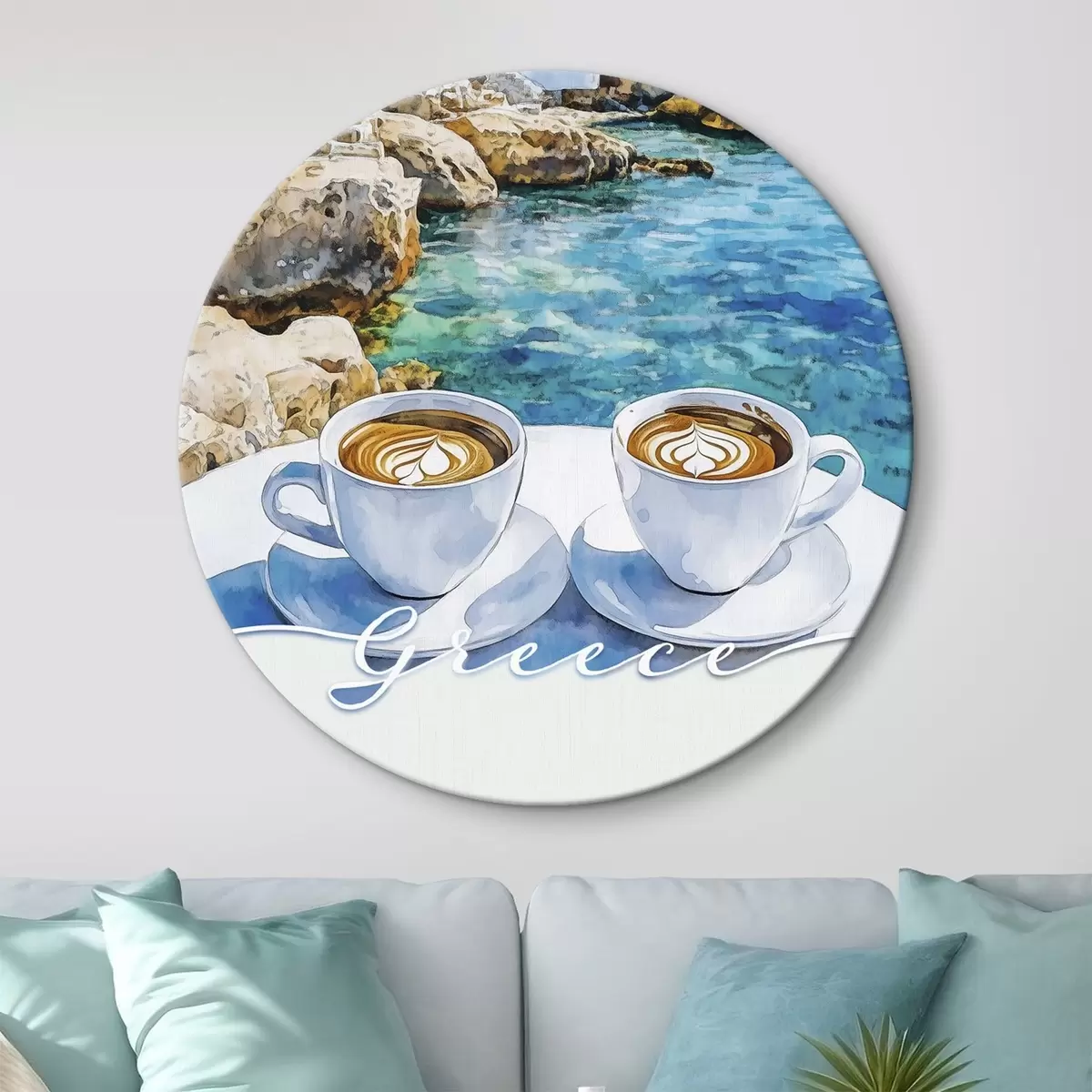Quadri rotondi Grecia estetica, tazze di caffè, mare blu, città vecchia, viaggio r42447