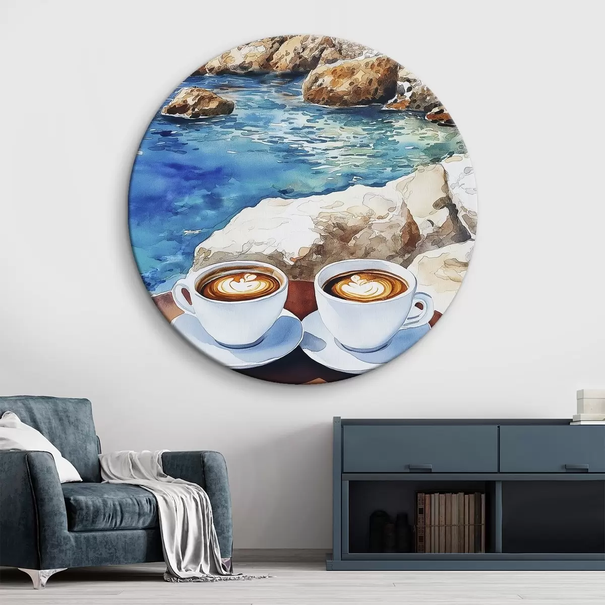 Quadri rotondi Acquerello lato mare con tazze di caffè, estate r42449