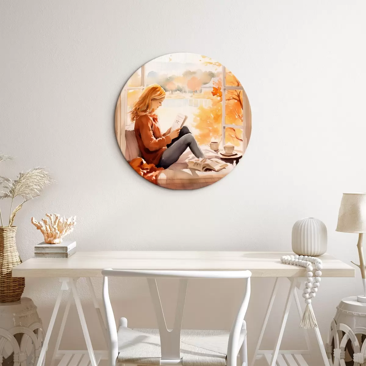 Quadri rotondi Una ragazza che legge un libro davanti a una finestra aperta in un paesaggio autunnale, con alberi chiari sullo sfondo e una tazza di tè accanto. r42572