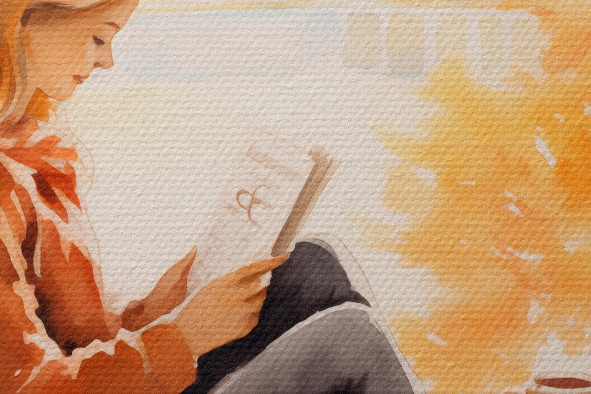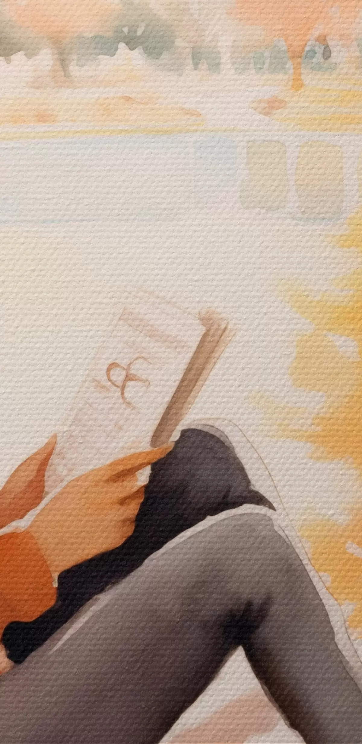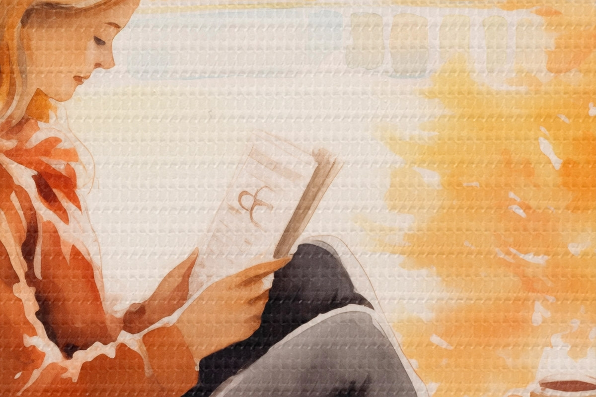 Immagine Una ragazza che legge un libro davanti a una finestra aperta in un paesaggio autunnale, con alberi chiari sullo sfondo e una tazza di tè accanto. Nr r42572