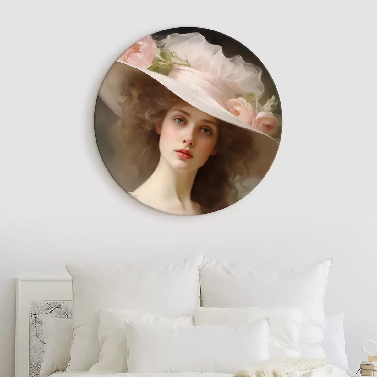 Quadri rotondi Ritratto di una giovane donna con un delicato abito rosa e un cappello ornato di fiori, dall'espressione romantica e raffinata. r42581