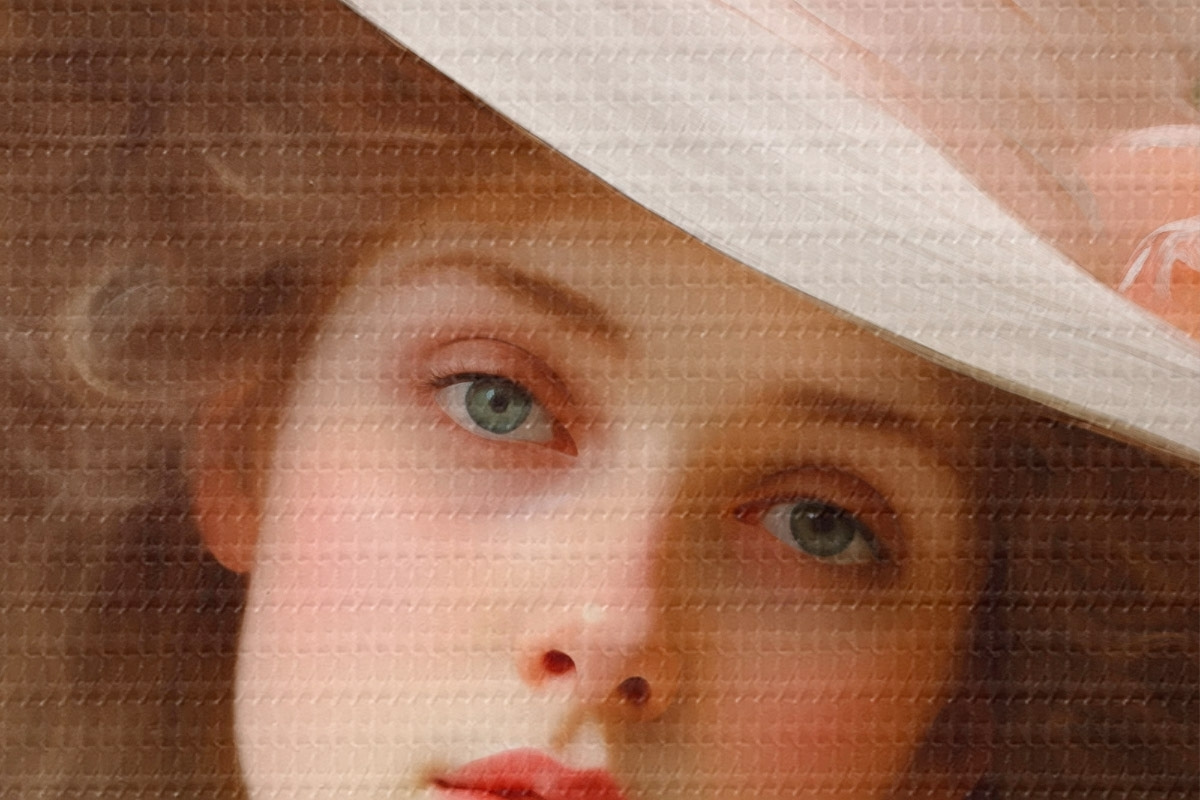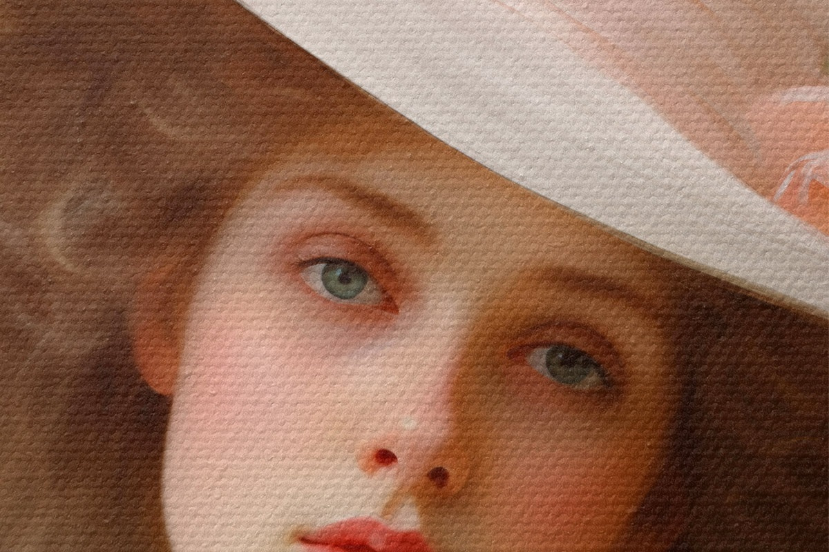 Immagine Ritratto di una giovane donna con un delicato abito rosa e un cappello ornato di fiori, dall'espressione romantica e raffinata. Nr r42581