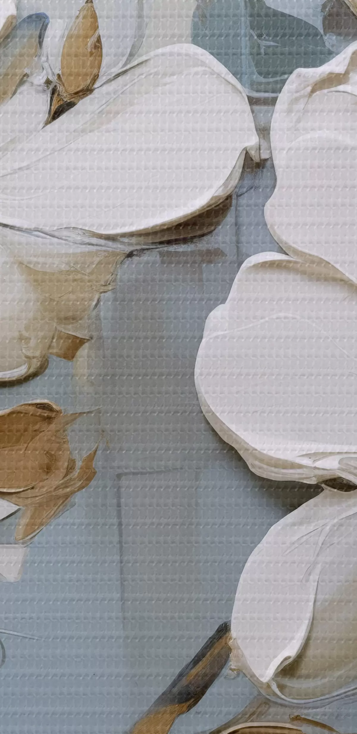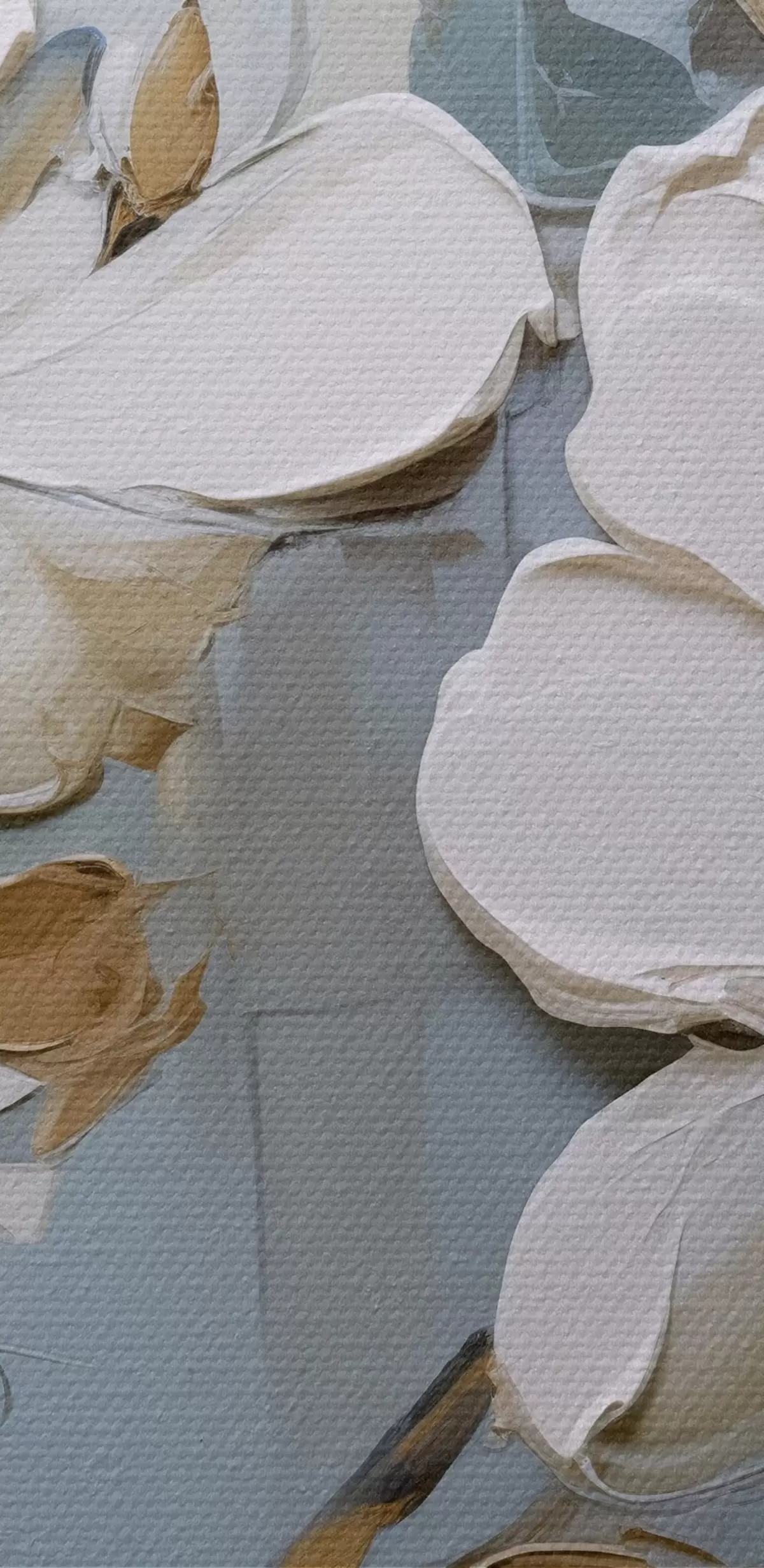 Immagine Fiori di magnolia bianchi con petali strutturati e foglie marroni su uno sfondo blu morbido imitazione pittura ad olio Nr r42711