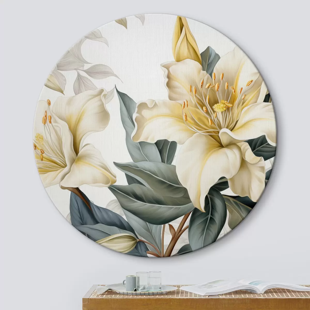 Quadri rotondi Illustrazione botanica di fiori bianchi e giallo pallido con petali intricati, circondati da foglie verdi r42712