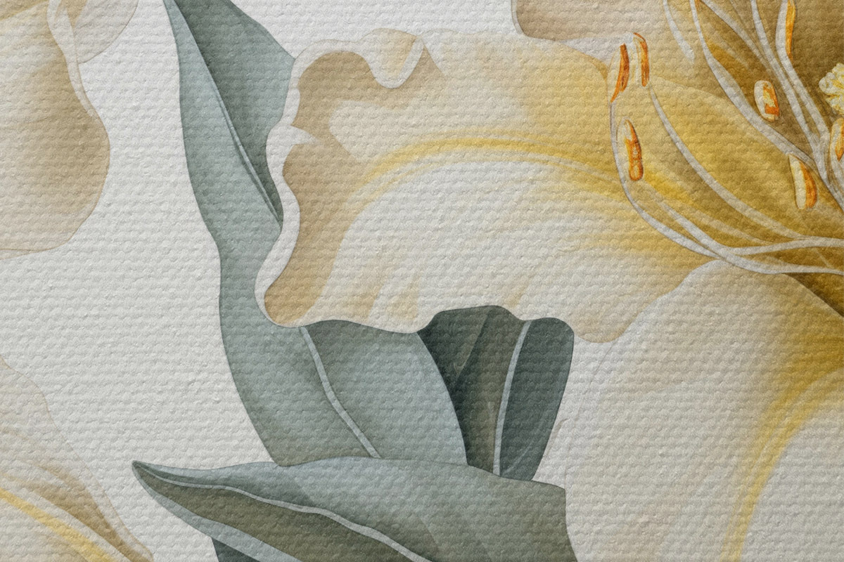 Immagine Illustrazione botanica di fiori bianchi e giallo pallido con petali intricati, circondati da foglie verdi Nr r42712