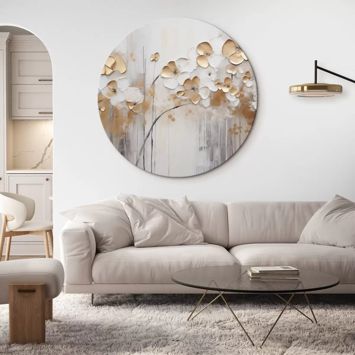 Quadri rotondi Fiori con petali strutturati su uno sfondo morbido e tenue con spruzzi di colore astratto e linee verticali r42713