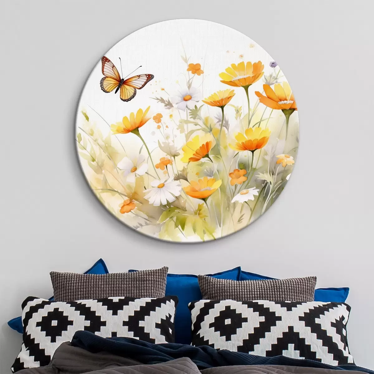 Quadri rotondi Un vivace campo di fiori ad acquerello con margherite bianche e arancioni e una farfalla che svolazza nelle vicinanze r42714