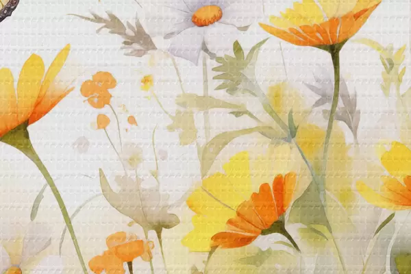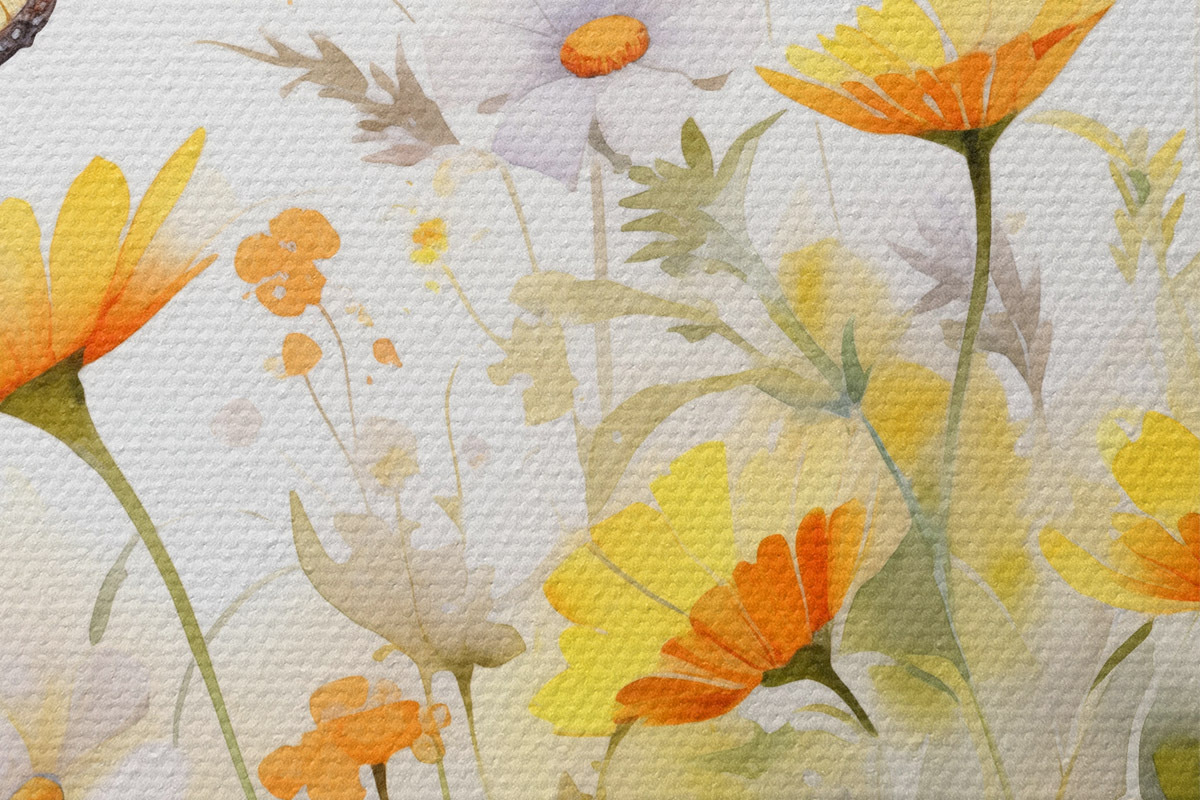 Immagine Un vivace campo di fiori ad acquerello con margherite bianche e arancioni e una farfalla che svolazza nelle vicinanze Nr r42714