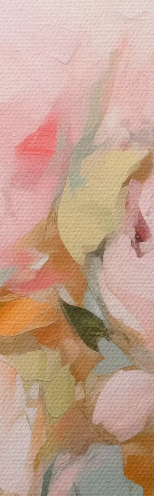 Immagine Dipinto a olio che imita grandi peonie rosa con petali morbidi e centri gialli, circondate da foglie verdi Nr r42720