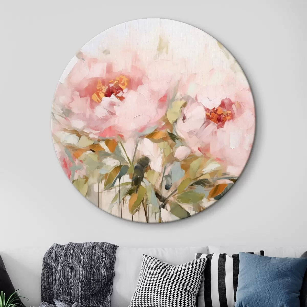 Quadri rotondi Dipinto a olio che imita grandi peonie rosa con petali morbidi e centri gialli, circondate da foglie verdi r42720