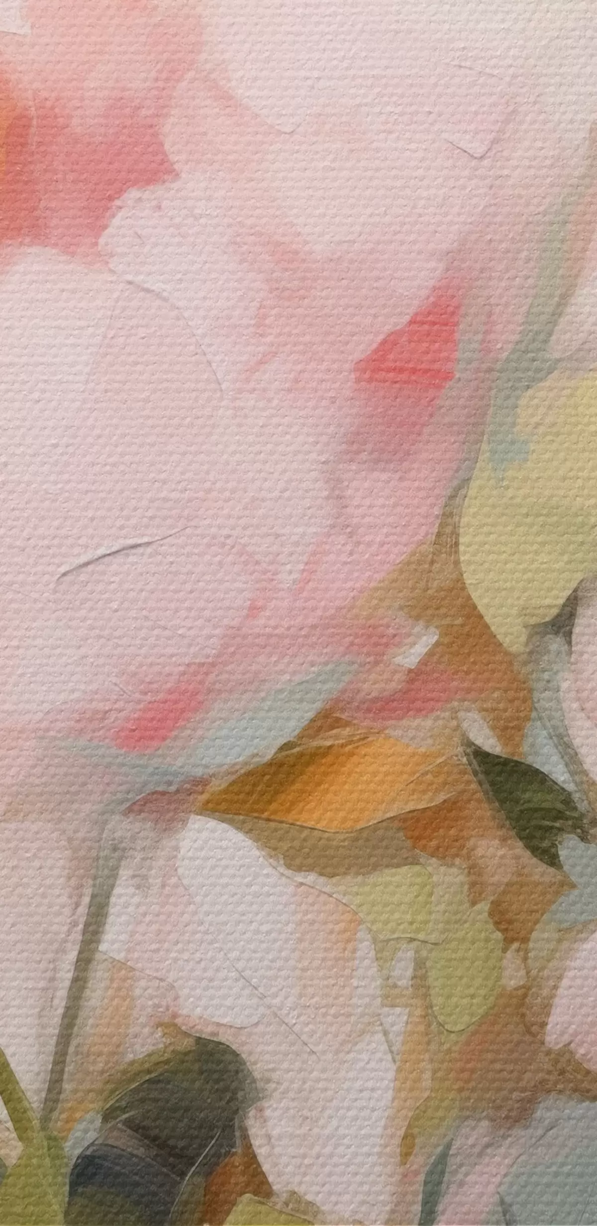 Immagine Dipinto a olio che imita grandi peonie rosa con petali morbidi e centri gialli, circondate da foglie verdi Nr r42720