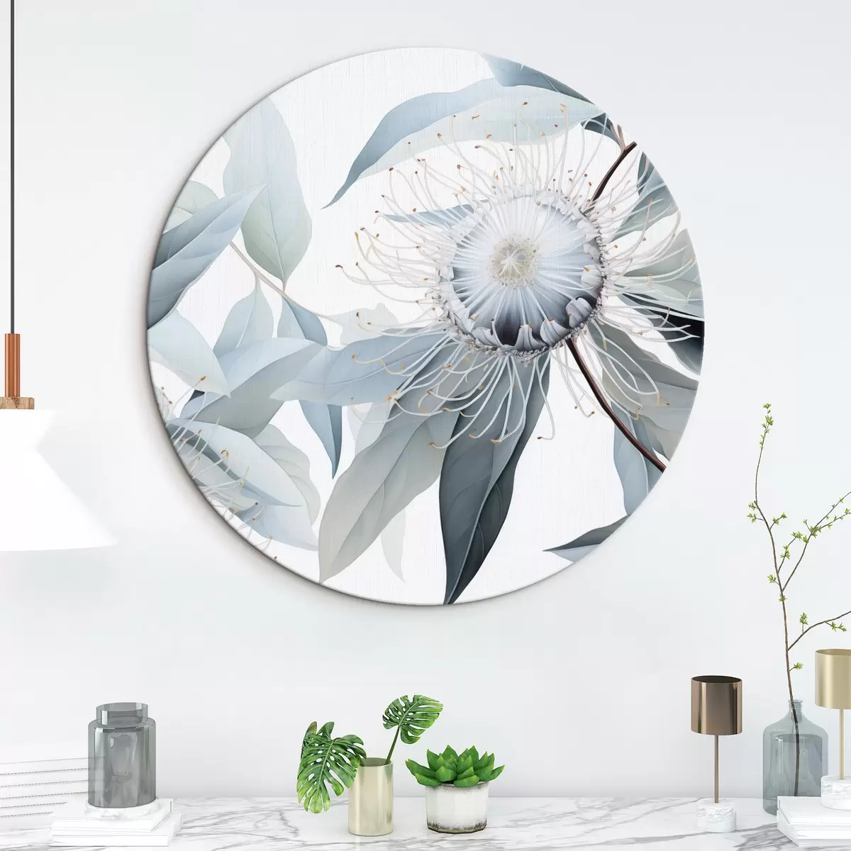 Quadri rotondi Illustrazione botanica dettagliata di fiori di eucalipto con filamenti bianchi, circondati da foglie morbide e verde chiaro r42725