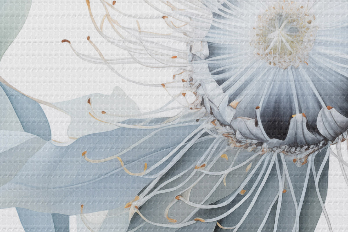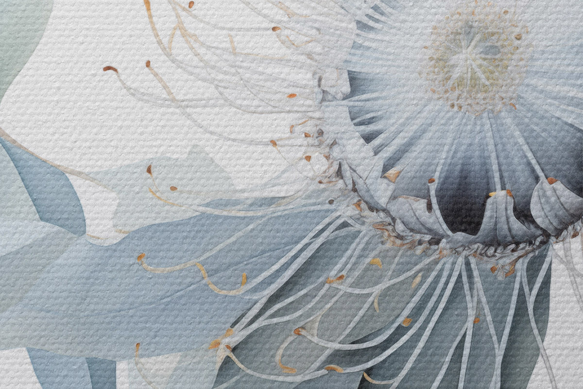 Immagine Illustrazione botanica dettagliata di fiori di eucalipto con filamenti bianchi, circondati da foglie morbide e verde chiaro Nr r42725