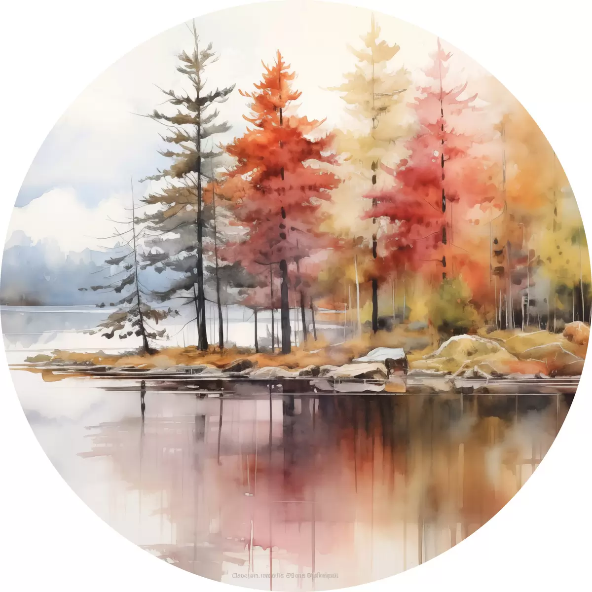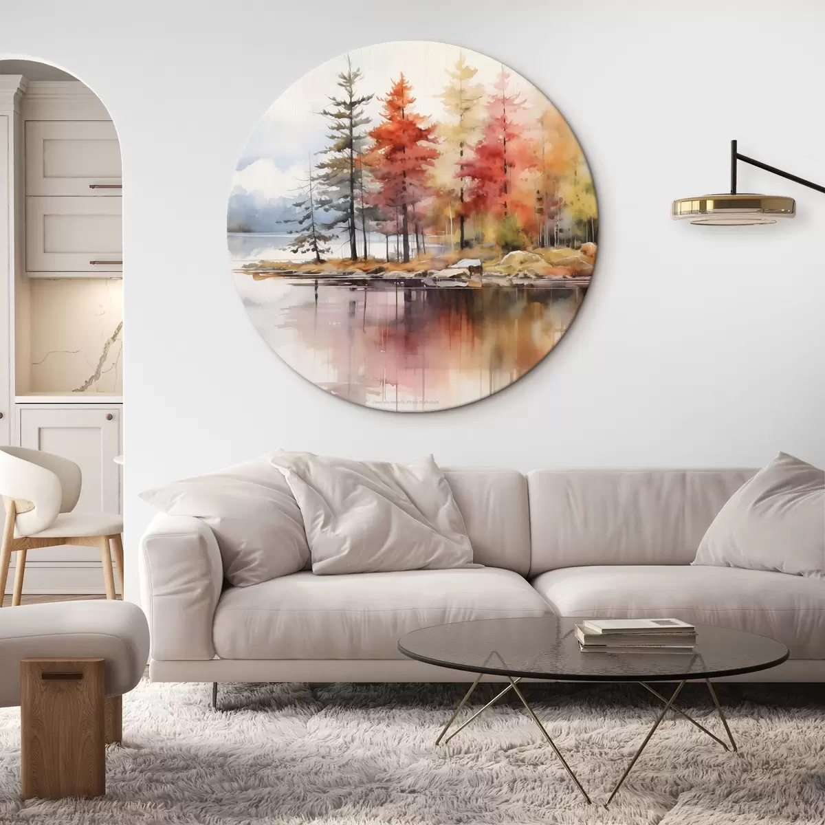 Quadri rotondi Paesaggio simile a un acquerello con un lago circondato da alberi dai vivaci colori autunnali r42727