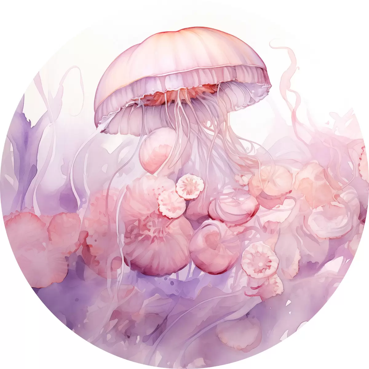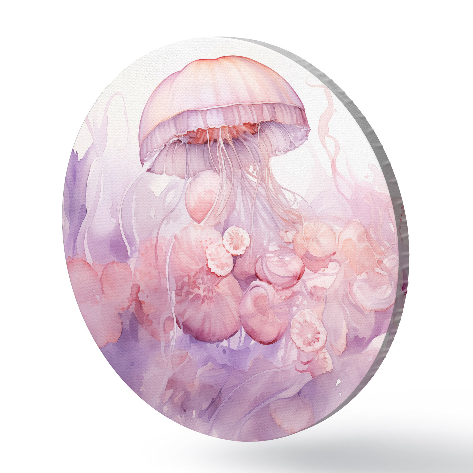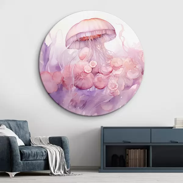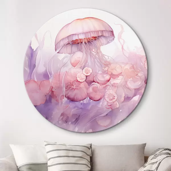 Quadri rotondi Meduse rosa che fluttuano in un turbinio di colori rosa e viola, circondate da forme astratte r42730