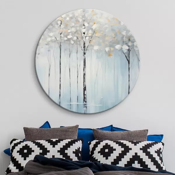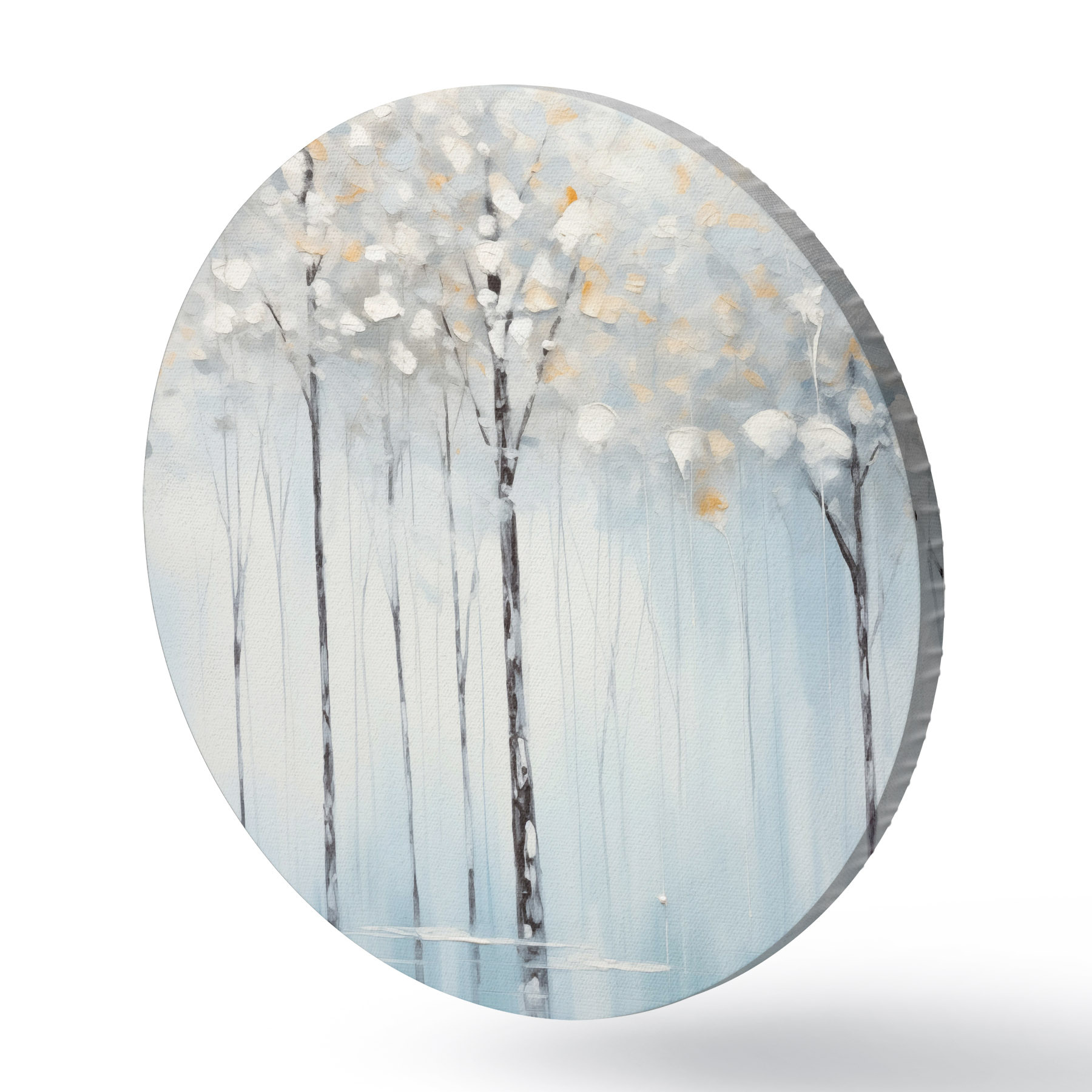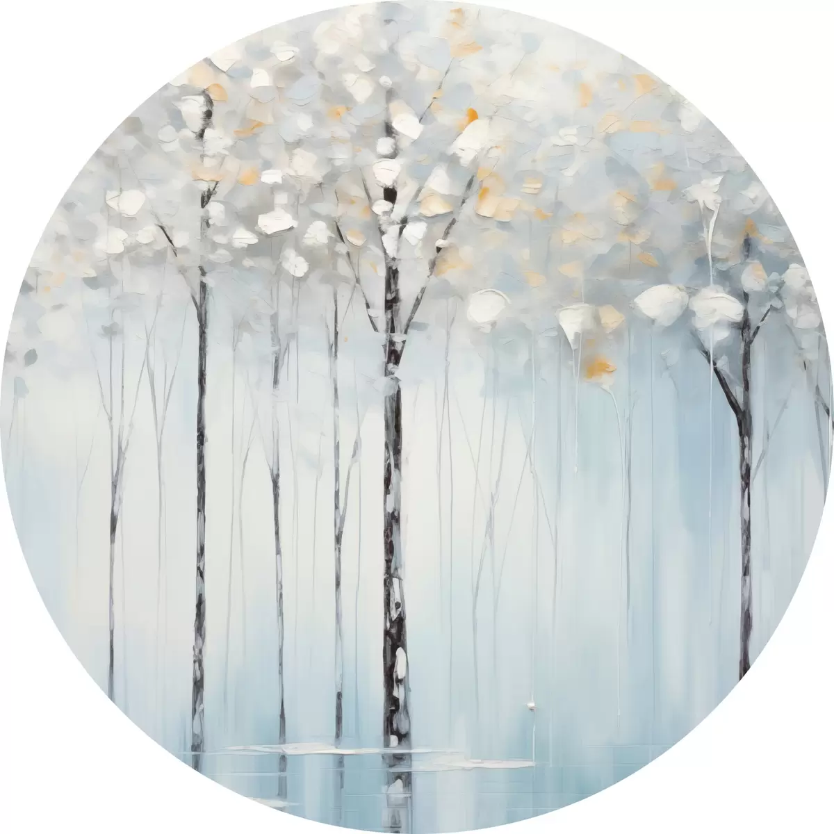 Quadri rotondi Alberi alti e slanciati con foglie blu e accenni di giallo su uno sfondo blu tenue, imitazione di pittura a olio r42731