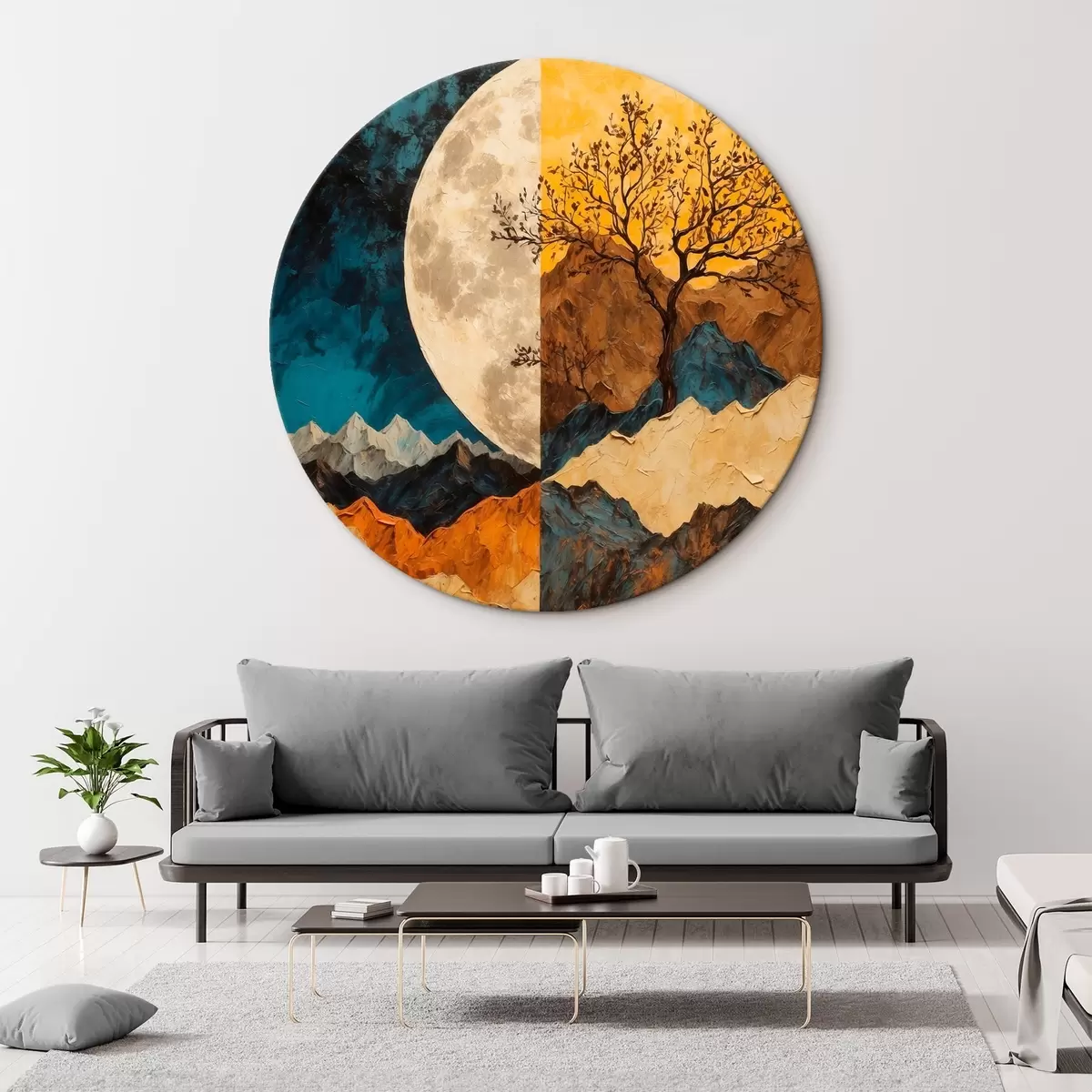 Quadri rotondi Montagna multicolore su sfondo lunare in pittura acrilica stile r42770