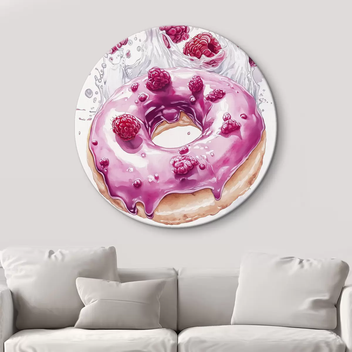 Quadri rotondi Ciambella con lamponi con glassa rosa, delizioso dessert, stile acquerello r42789