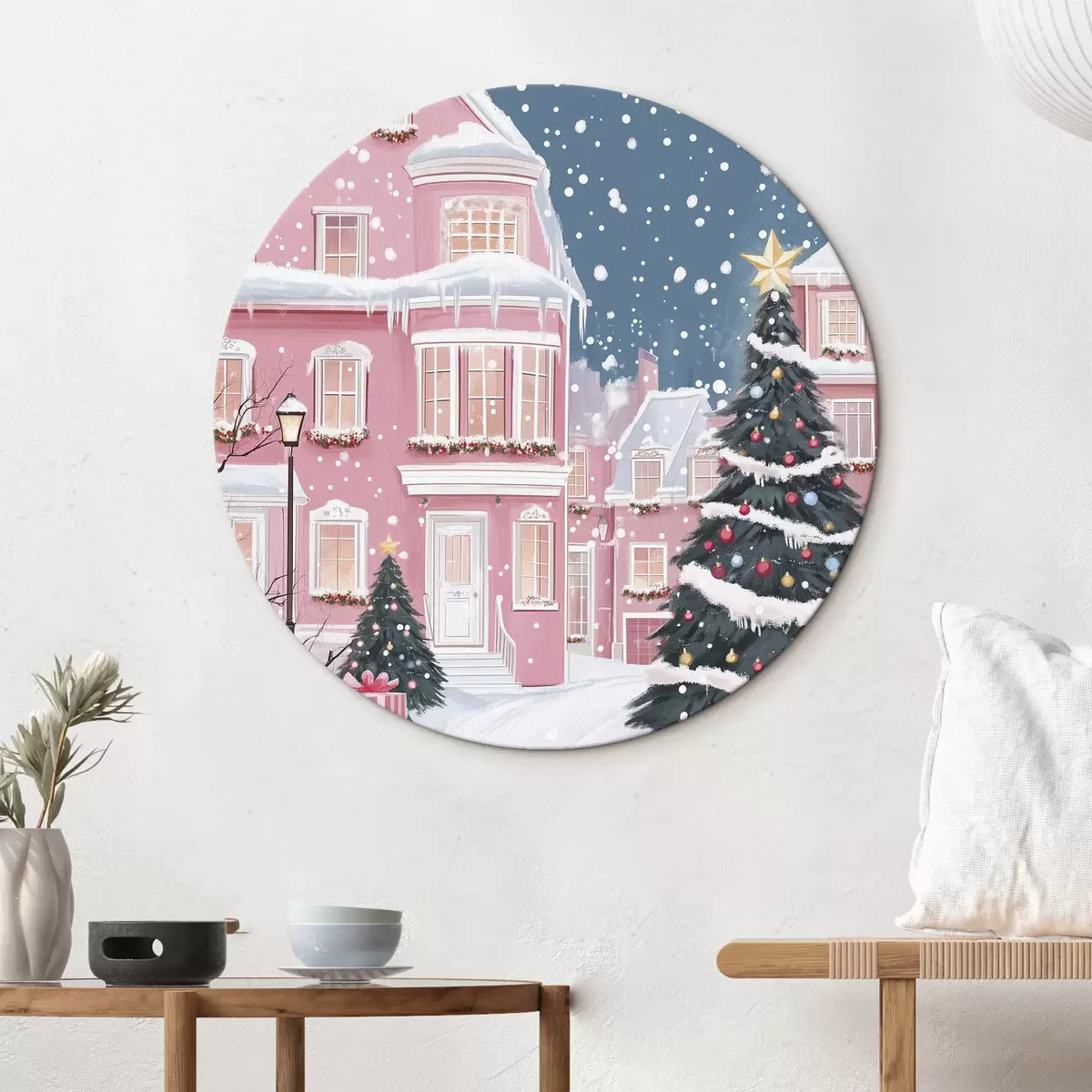 Quadri rotondi Città invernale con case rosa, alberi di Natale e fiocchi di neve r42792
